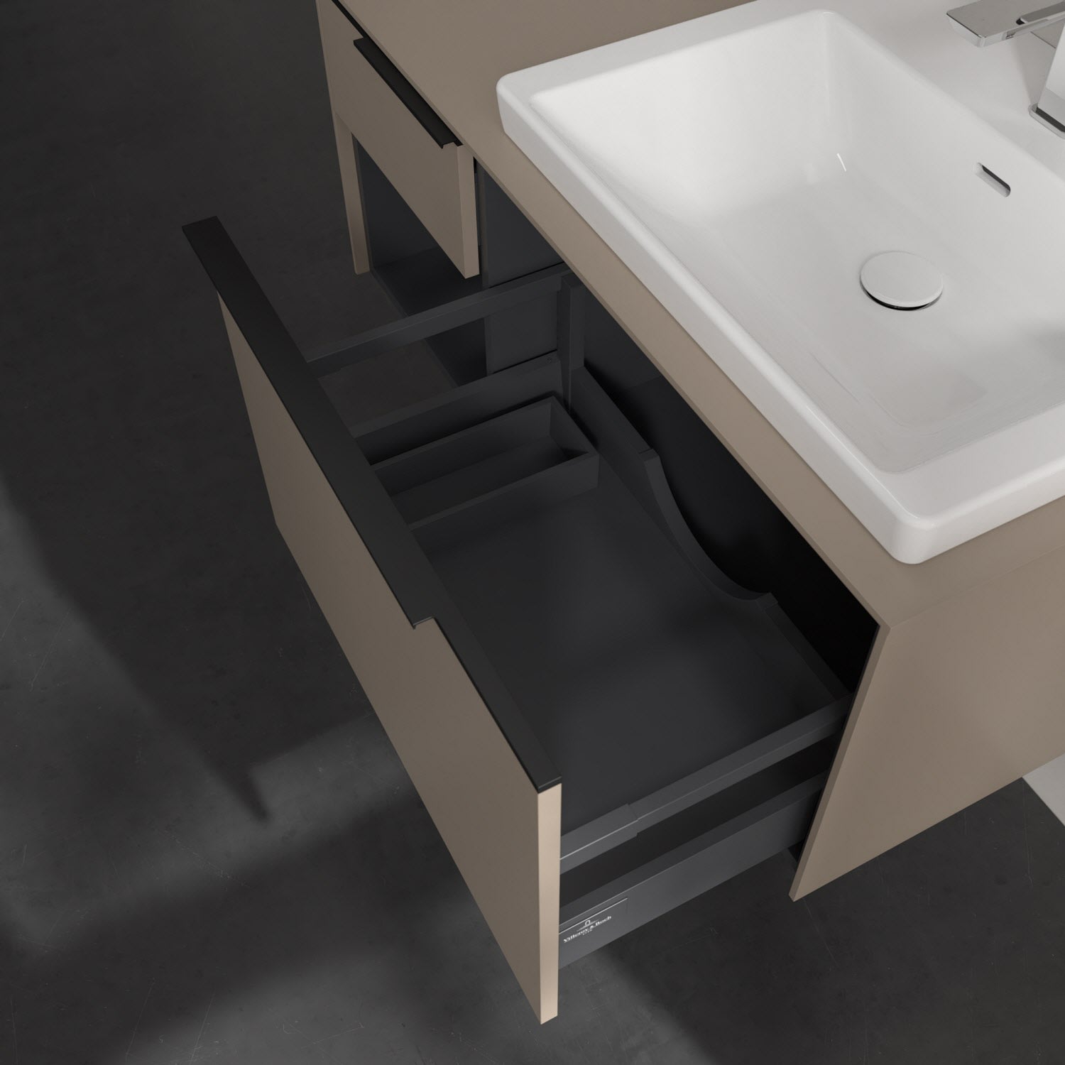 Der Waschtischunterschrank der Kollektion Subway 3.0 von Villeroy & Boch besticht durch gradliniges, zeitloses Design und großzügigen Stauraum. Front und Korpus sind mit einer hochwertigen Direktbeschichtung oder Lackierung, deren Anti-Fingerprint-Oberfläche unschönen Fingerabdrücken vorbeugt, versehen. Für eine einfache Handhabung sorgt eine dezente Griffleiste. Zwei voll ausziehbare Schubladen mit rutschhemmenden Böden, Selbsteinzug-Funktion und zwei integrierten kleinen Accessory-Boxen bieten besonders viel Platz für Pflege- und Hygieneartikel. Linkerhand schafft ein Regalelement zusätzlichen Stauraum. Die Auszüge sind mit einer funktionalen LED-Leiste ausgestattet, die mit neutralweißem Licht das Innenleben beleuchtet. Highlight ist die LED-Bodenbeleuchtung, die stimmungsvolles, sanftes Licht ins Bad bringt und nachts als Orientierungshilfe dient. Helligkeit und Lichtfarbe können über den kapazitiven Sensor eingestellt werden. Die LED-Leuchten lassen sich durch einen Fachhandwerker austauschen.