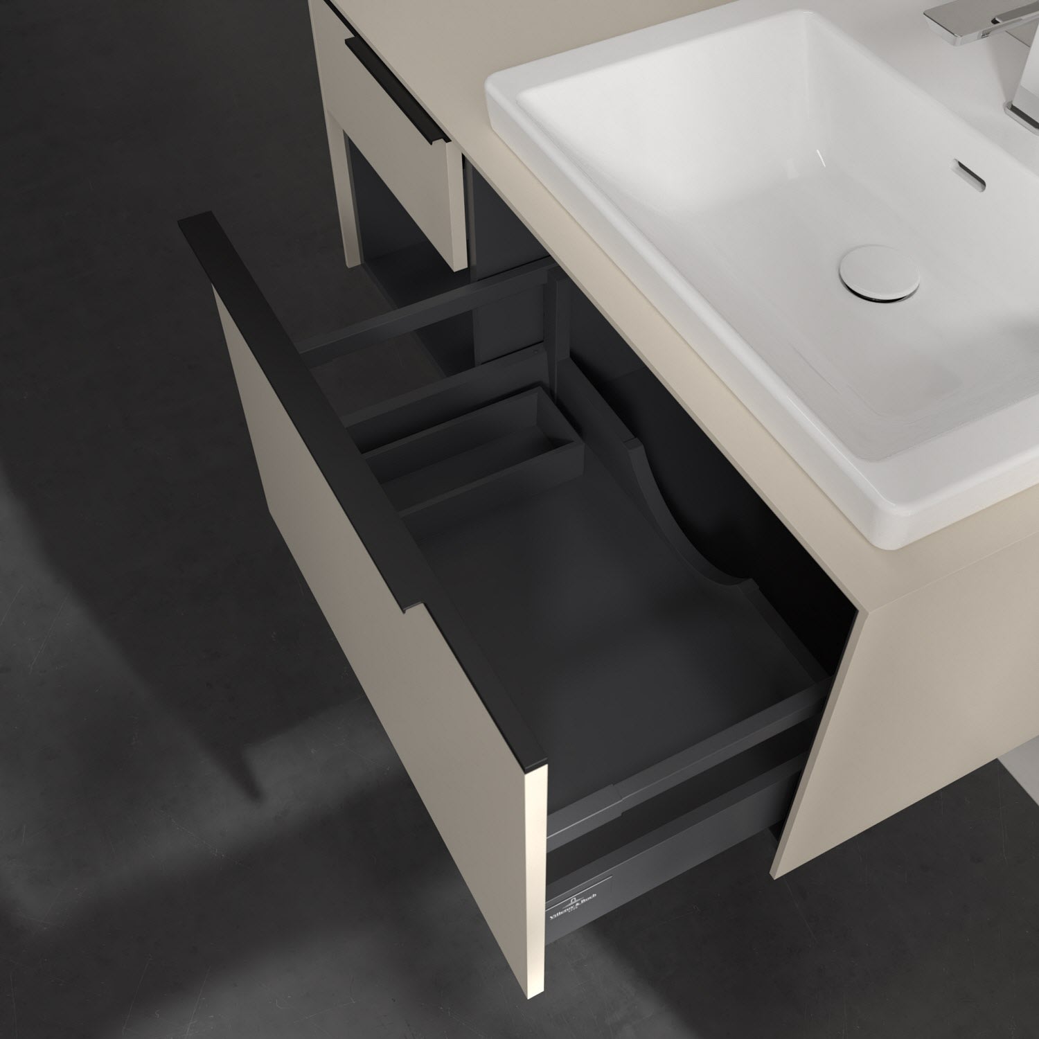 Der Waschtischunterschrank der Kollektion Subway 3.0 von Villeroy & Boch besticht durch gradliniges, zeitloses Design und großzügigen Stauraum. Front und Korpus sind mit einer hochwertigen Direktbeschichtung oder Lackierung, deren Anti-Fingerprint-Oberfläche unschönen Fingerabdrücken vorbeugt, versehen. Für eine einfache Handhabung sorgt eine dezente Griffleiste. Zwei voll ausziehbare Schubladen mit rutschhemmenden Böden, Selbsteinzug-Funktion und zwei integrierten kleinen Accessory-Boxen bieten besonders viel Platz für Pflege- und Hygieneartikel. Linkerhand schafft ein Regalelement zusätzlichen Stauraum. Die Auszüge sind mit einer funktionalen LED-Leiste ausgestattet, die mit neutralweißem Licht das Innenleben beleuchtet. Highlight ist die LED-Bodenbeleuchtung, die stimmungsvolles, sanftes Licht ins Bad bringt und nachts als Orientierungshilfe dient. Helligkeit und Lichtfarbe können über den kapazitiven Sensor eingestellt werden. Die LED-Leuchten lassen sich durch einen Fachhandwerker austauschen.