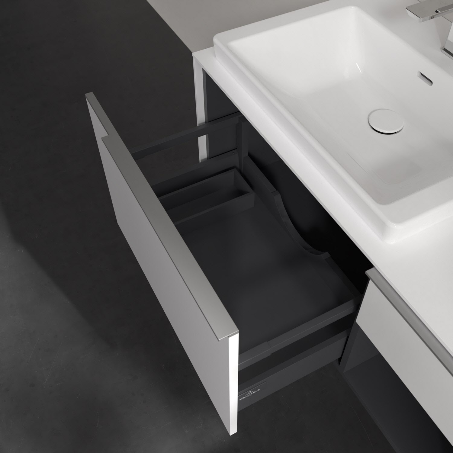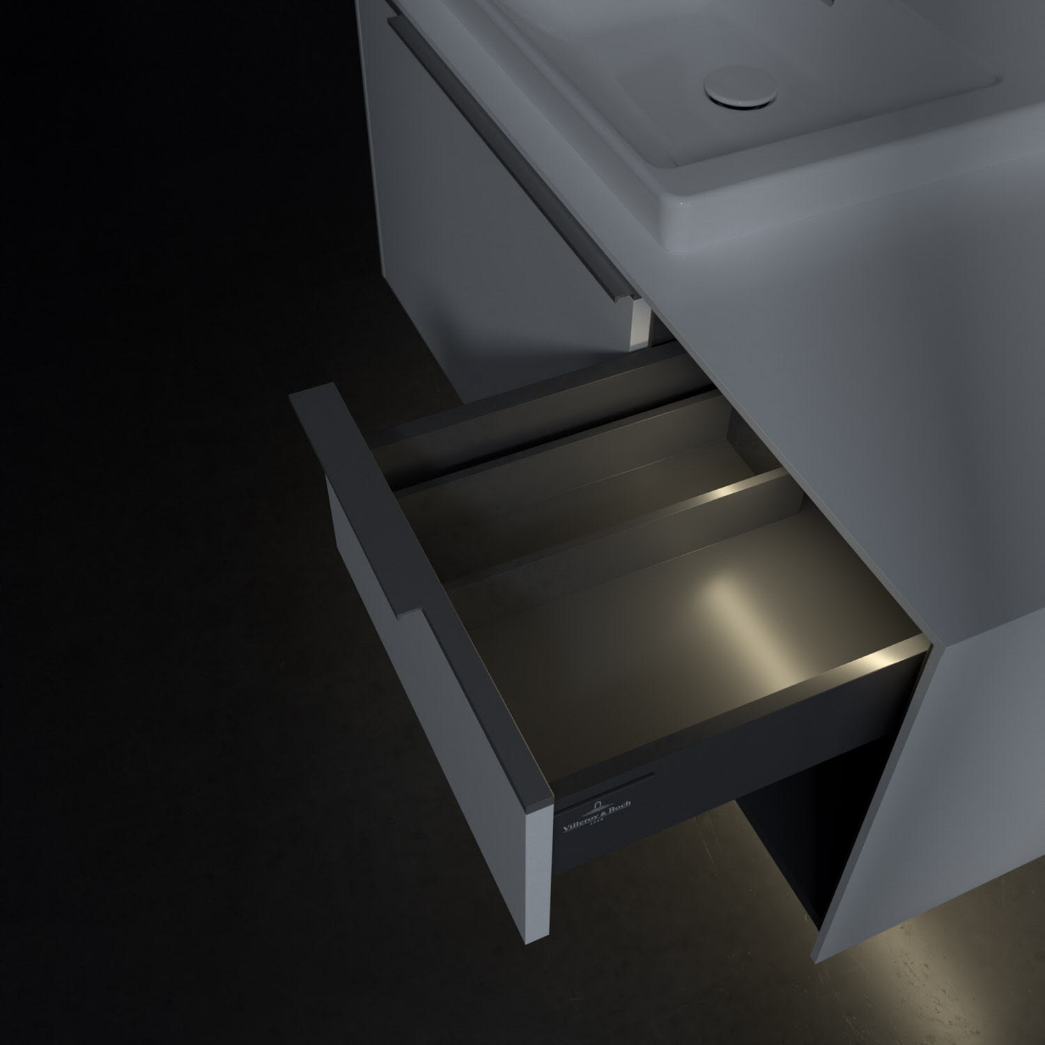 Der Waschtischunterschrank der Kollektion Subway 3.0 von Villeroy & Boch besticht durch gradliniges, zeitloses Design und großzügigen Stauraum. Front und Korpus sind mit einer hochwertigen Direktbeschichtung oder Lackierung, deren Anti-Fingerprint-Oberfläche unschönen Fingerabdrücken vorbeugt, versehen. Für eine einfache Handhabung sorgt eine dezente Griffleiste. Zwei voll ausziehbare Schubladen mit rutschhemmenden Böden, Selbsteinzug-Funktion und zwei integrierten kleinen Accessory-Boxen bieten besonders viel Platz für Pflege- und Hygieneartikel. Rechterhand schafft ein Regalelement zusätzlichen Stauraum. Die Auszüge sind mit einer funktionalen LED-Leiste ausgestattet, die mit neutralweißem Licht das Innenleben beleuchtet. Highlight ist die LED-Bodenbeleuchtung, die stimmungsvolles, sanftes Licht ins Bad bringt und nachts als Orientierungshilfe dient. Helligkeit und Lichtfarbe können über den kapazitiven Sensor eingestellt werden. Die LED-Leuchten lassen sich durch einen Fachhandwerker austauschen.