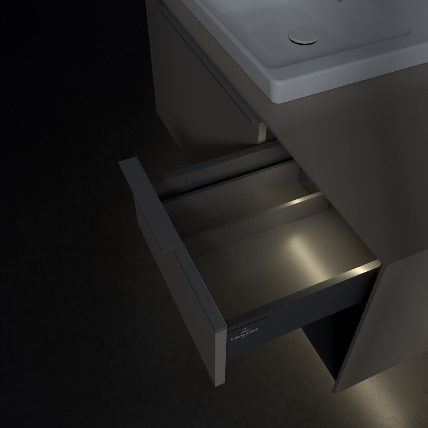 Der Waschtischunterschrank der Kollektion Subway 3.0 von Villeroy & Boch besticht durch gradliniges, zeitloses Design und großzügigen Stauraum. Front und Korpus sind mit einer hochwertigen Direktbeschichtung oder Lackierung, deren Anti-Fingerprint-Oberfläche unschönen Fingerabdrücken vorbeugt, versehen. Für eine einfache Handhabung sorgt eine dezente Griffleiste. Zwei voll ausziehbare Schubladen mit rutschhemmenden Böden, Selbsteinzug-Funktion und zwei integrierten kleinen Accessory-Boxen bieten besonders viel Platz für Pflege- und Hygieneartikel. Rechterhand schafft ein Regalelement zusätzlichen Stauraum. Die Auszüge sind mit einer funktionalen LED-Leiste ausgestattet, die mit neutralweißem Licht das Innenleben beleuchtet. Highlight ist die LED-Bodenbeleuchtung, die stimmungsvolles, sanftes Licht ins Bad bringt und nachts als Orientierungshilfe dient. Helligkeit und Lichtfarbe können über den kapazitiven Sensor eingestellt werden. Die LED-Leuchten lassen sich durch einen Fachhandwerker austauschen.