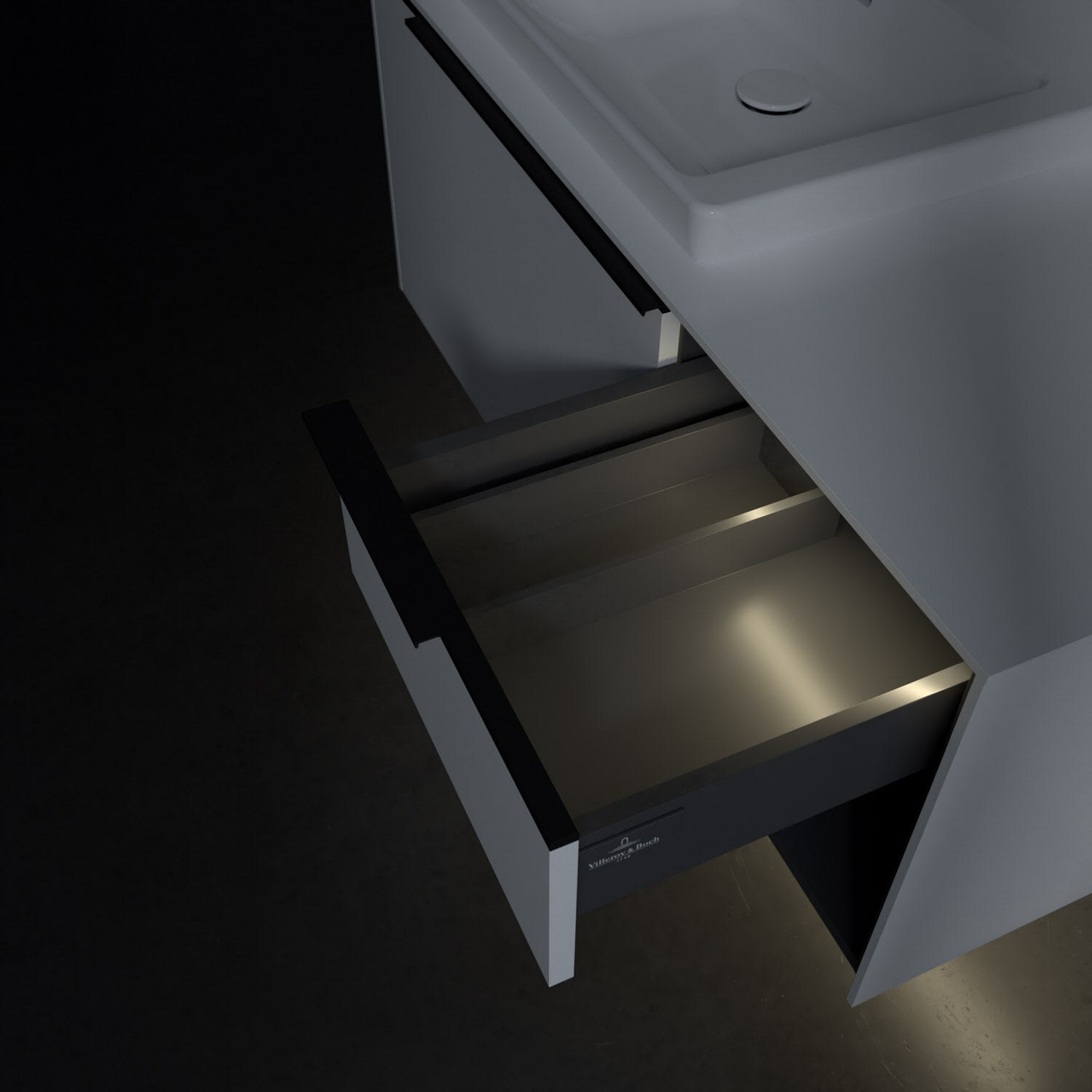 Der Waschtischunterschrank der Kollektion Subway 3.0 von Villeroy & Boch besticht durch gradliniges, zeitloses Design und großzügigen Stauraum. Front und Korpus sind mit einer hochwertigen Direktbeschichtung oder Lackierung, deren Anti-Fingerprint-Oberfläche unschönen Fingerabdrücken vorbeugt, versehen. Für eine einfache Handhabung sorgt eine dezente Griffleiste. Zwei voll ausziehbare Schubladen mit rutschhemmenden Böden, Selbsteinzug-Funktion und zwei integrierten kleinen Accessory-Boxen bieten besonders viel Platz für Pflege- und Hygieneartikel. Rechterhand schafft ein Regalelement zusätzlichen Stauraum. Die Auszüge sind mit einer funktionalen LED-Leiste ausgestattet, die mit neutralweißem Licht das Innenleben beleuchtet. Highlight ist die LED-Bodenbeleuchtung, die stimmungsvolles, sanftes Licht ins Bad bringt und nachts als Orientierungshilfe dient. Helligkeit und Lichtfarbe können über den kapazitiven Sensor eingestellt werden. Die LED-Leuchten lassen sich durch einen Fachhandwerker austauschen.