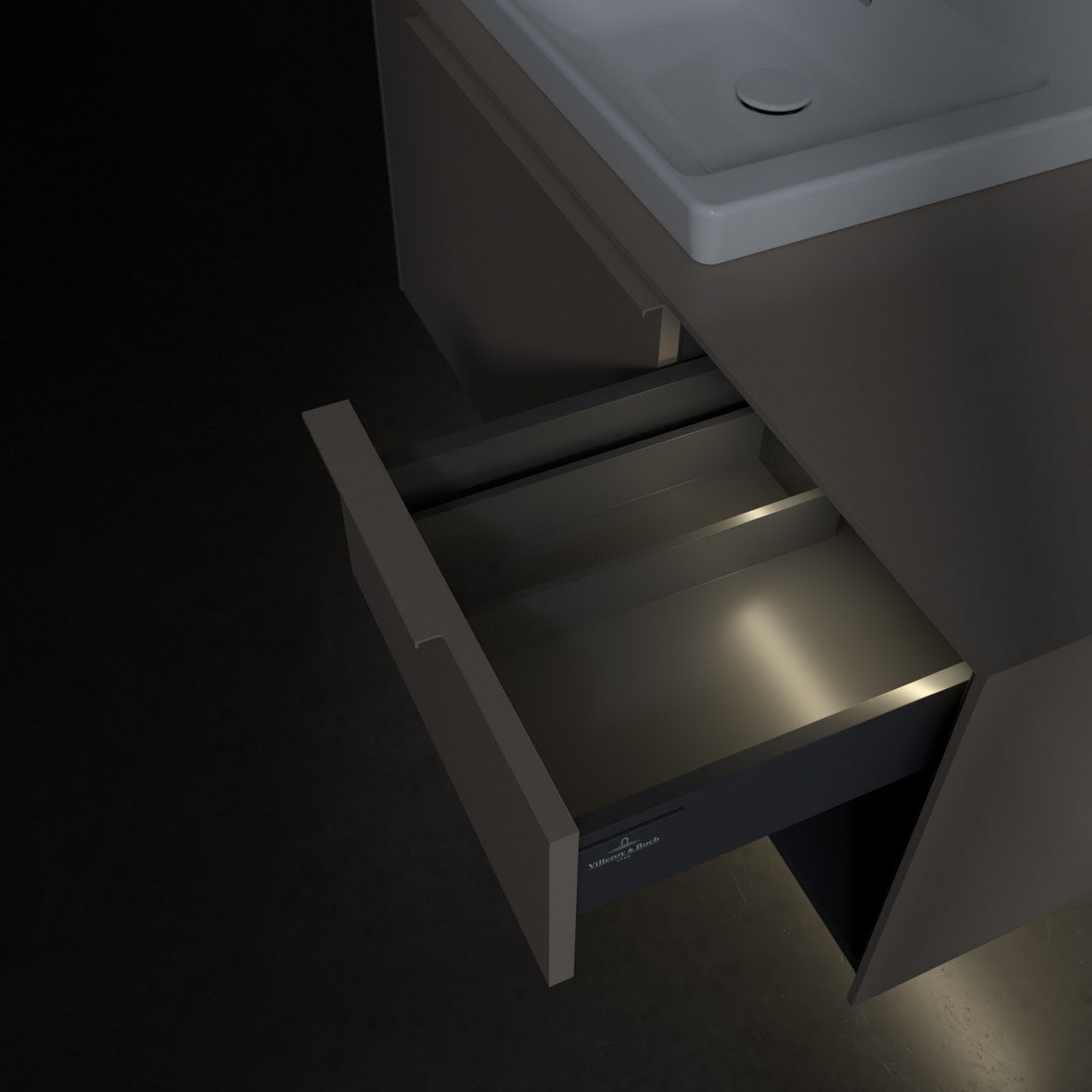 Der Waschtischunterschrank der Kollektion Subway 3.0 von Villeroy & Boch besticht durch gradliniges, zeitloses Design und großzügigen Stauraum. Front und Korpus sind mit einer hochwertigen Direktbeschichtung oder Lackierung, deren Anti-Fingerprint-Oberfläche unschönen Fingerabdrücken vorbeugt, versehen. Für eine einfache Handhabung sorgt eine dezente Griffleiste. Zwei voll ausziehbare Schubladen mit rutschhemmenden Böden, Selbsteinzug-Funktion und zwei integrierten kleinen Accessory-Boxen bieten besonders viel Platz für Pflege- und Hygieneartikel. Rechterhand schafft ein Regalelement zusätzlichen Stauraum. Die Auszüge sind mit einer funktionalen LED-Leiste ausgestattet, die mit neutralweißem Licht das Innenleben beleuchtet. Highlight ist die LED-Bodenbeleuchtung, die stimmungsvolles, sanftes Licht ins Bad bringt und nachts als Orientierungshilfe dient. Helligkeit und Lichtfarbe können über den kapazitiven Sensor eingestellt werden. Die LED-Leuchten lassen sich durch einen Fachhandwerker austauschen.