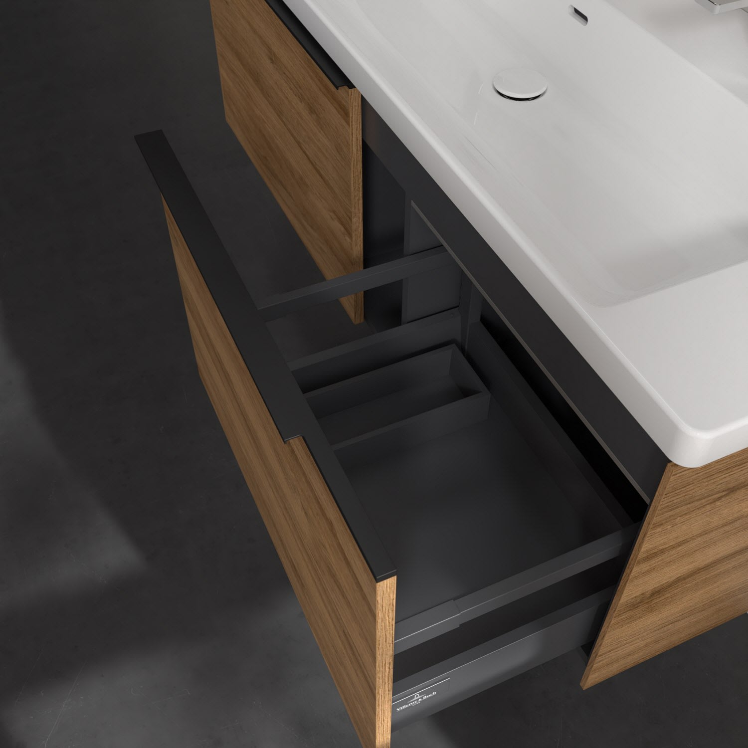 Der Waschtischunterschrank der Kollektion Subway 3.0 von Villeroy & Boch besticht durch gradliniges, zeitloses Design und großzügigen Stauraum. Front und Korpus sind mit einer hochwertigen Direktbeschichtung oder Lackierung, deren Anti-Fingerprint-Oberfläche unschönen Fingerabdrücken vorbeugt, versehen. Für eine einfache Handhabung sorgt eine dezente Griffleiste. Zwei voll ausziehbare Schubladen mit rutschhemmenden Böden, Selbsteinzug-Funktion und zwei integrierten kleinen Accessory-Boxen bieten besonders viel Platz für Pflege- und Hygieneartikel. Die beiden Auszüge sind mit einer funktionalen LED-Leiste ausgestattet, die mit neutralweißem Licht das Innenleben beleuchtet. Highlight ist die LED-Bodenbeleuchtung, die stimmungsvolles, sanftes Licht ins Bad bringt und nachts als Orientierungshilfe dient. Helligkeit und Lichtfarbe können über den kapazitiven Sensor eingestellt werden. Die LED-Leuchten lassen sich durch einen Fachhandwerker austauschen.