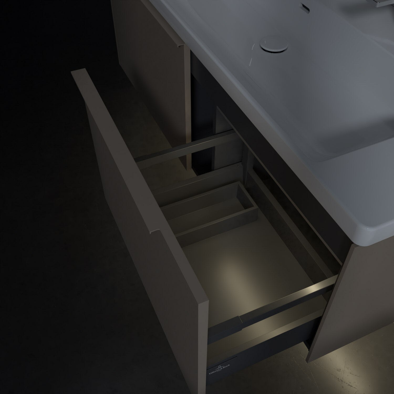 Der Waschtischunterschrank der Kollektion Subway 3.0 von Villeroy & Boch besticht durch gradliniges, zeitloses Design und großzügigen Stauraum. Front und Korpus sind mit einer hochwertigen Direktbeschichtung oder Lackierung, deren Anti-Fingerprint-Oberfläche unschönen Fingerabdrücken vorbeugt, versehen. Für eine einfache Handhabung sorgt eine dezente Griffleiste. Zwei voll ausziehbare Schubladen mit rutschhemmenden Böden, Selbsteinzug-Funktion und zwei integrierten kleinen Accessory-Boxen bieten besonders viel Platz für Pflege- und Hygieneartikel. Die beiden Auszüge sind mit einer funktionalen LED-Leiste ausgestattet, die mit neutralweißem Licht das Innenleben beleuchtet. Highlight ist die LED-Bodenbeleuchtung, die stimmungsvolles, sanftes Licht ins Bad bringt und nachts als Orientierungshilfe dient. Helligkeit und Lichtfarbe können über den kapazitiven Sensor eingestellt werden. Die LED-Leuchten lassen sich durch einen Fachhandwerker austauschen.