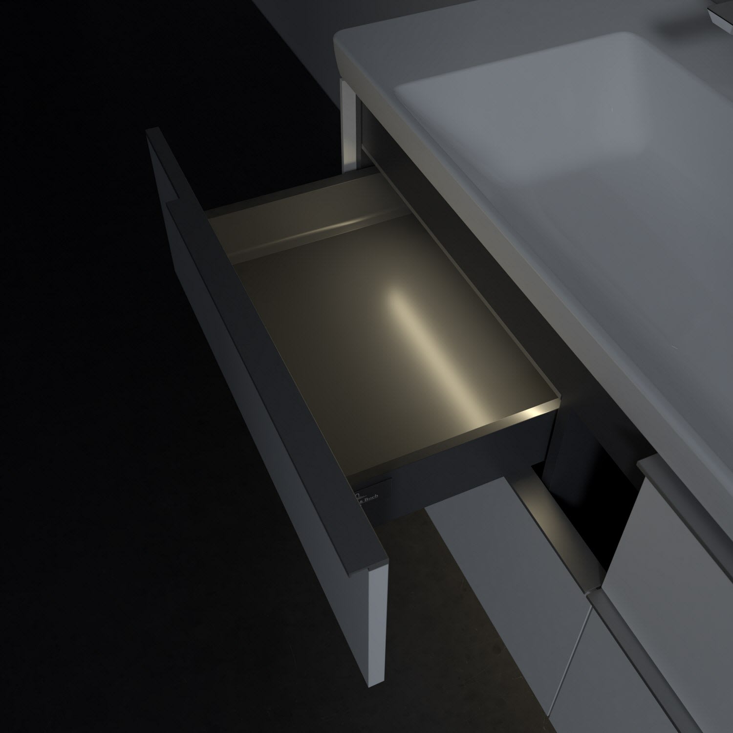 Der Waschtischunterschrank der Kollektion Subway 3.0 von Villeroy & Boch besticht durch gradliniges, zeitloses Design und großzügigen Stauraum. Front und Korpus sind mit einer hochwertigen Direktbeschichtung oder Lackierung, deren Anti-Fingerprint-Oberfläche unschönen Fingerabdrücken vorbeugt, versehen. Für eine einfache Handhabung sorgt eine dezente Griffleiste. Vier voll ausziehbare Schubladen mit rutschhemmenden Böden, Selbsteinzug-Funktion und zwei integrierten kleinen Accessory-Boxen bieten extra viel Platz für Pflege- und Hygieneartikel. Die beiden oberen Auszüge sind mit einer funktionalen LED-Leiste ausgestattet, die mit neutralweißem Licht das Innenleben beleuchtet. Highlight ist die LED-Bodenbeleuchtung, die stimmungsvolles, sanftes Licht ins Bad bringt und nachts als Orientierungshilfe dient. Helligkeit und Lichtfarbe können über den kapazitiven Sensor eingestellt werden. Die LED-Leuchten lassen sich durch einen Fachhandwerker austauschen.