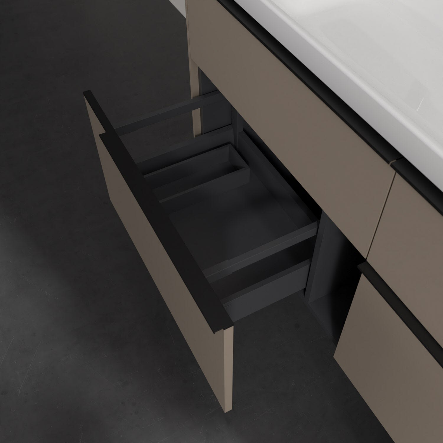 Der Waschtischunterschrank der Kollektion Subway 3.0 von Villeroy & Boch besticht durch gradliniges, zeitloses Design und großzügigen Stauraum. Front und Korpus sind mit einer hochwertigen Direktbeschichtung oder Lackierung, deren Anti-Fingerprint-Oberfläche unschönen Fingerabdrücken vorbeugt, versehen. Für eine einfache Handhabung sorgt eine dezente Griffleiste. Vier voll ausziehbare Schubladen mit rutschhemmenden Böden, Selbsteinzug-Funktion und zwei integrierten kleinen Accessory-Boxen bieten extra viel Platz für Pflege- und Hygieneartikel. Die beiden oberen Auszüge sind mit einer funktionalen LED-Leiste ausgestattet, die mit neutralweißem Licht das Innenleben beleuchtet. Highlight ist die LED-Bodenbeleuchtung, die stimmungsvolles, sanftes Licht ins Bad bringt und nachts als Orientierungshilfe dient. Helligkeit und Lichtfarbe können über den kapazitiven Sensor eingestellt werden. Die LED-Leuchten lassen sich durch einen Fachhandwerker austauschen.