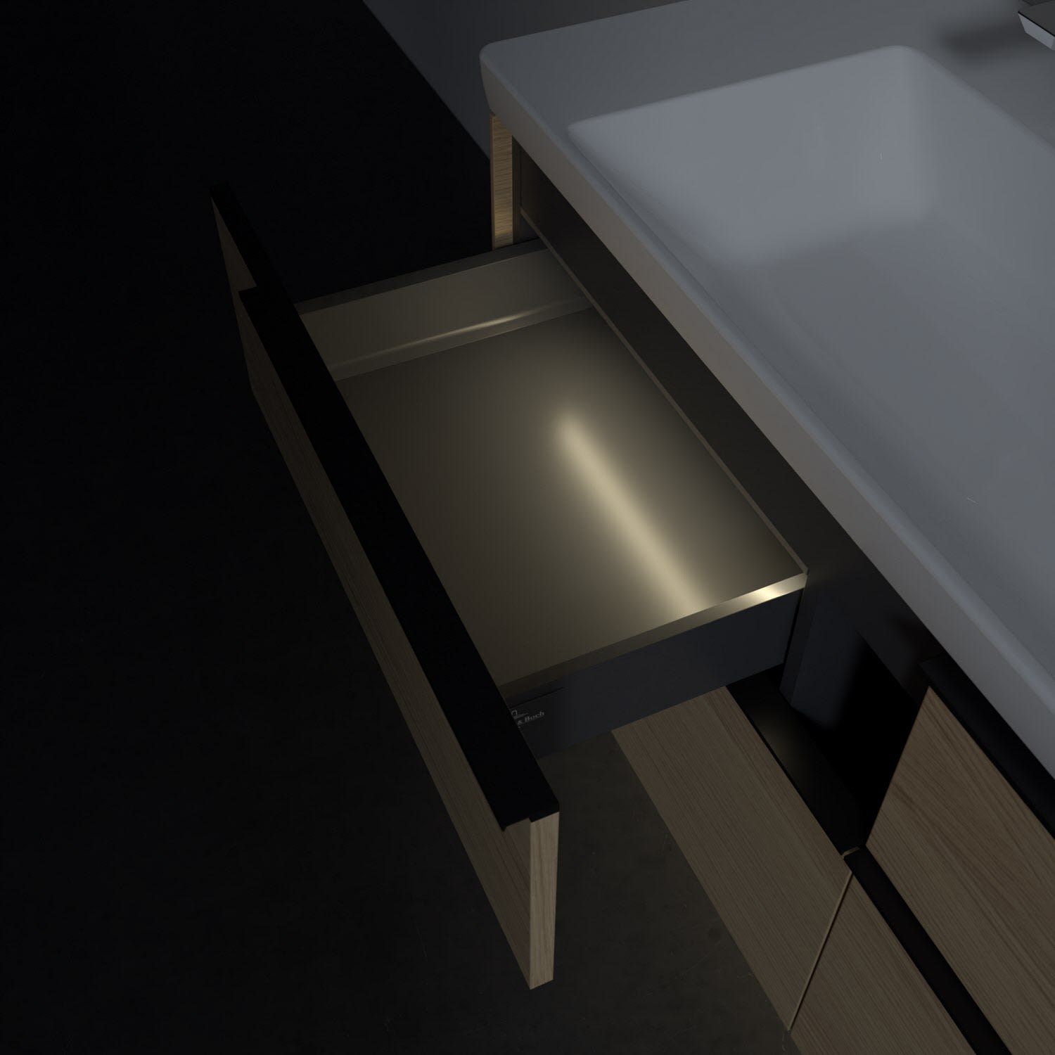 Der Waschtischunterschrank der Kollektion Subway 3.0 von Villeroy & Boch besticht durch gradliniges, zeitloses Design und großzügigen Stauraum. Front und Korpus sind mit einer hochwertigen Direktbeschichtung oder Lackierung, deren Anti-Fingerprint-Oberfläche unschönen Fingerabdrücken vorbeugt, versehen. Für eine einfache Handhabung sorgt eine dezente Griffleiste. Vier voll ausziehbare Schubladen mit rutschhemmenden Böden, Selbsteinzug-Funktion und zwei integrierten kleinen Accessory-Boxen bieten extra viel Platz für Pflege- und Hygieneartikel. Die beiden oberen Auszüge sind mit einer funktionalen LED-Leiste ausgestattet, die mit neutralweißem Licht das Innenleben beleuchtet. Highlight ist die LED-Bodenbeleuchtung, die stimmungsvolles, sanftes Licht ins Bad bringt und nachts als Orientierungshilfe dient. Helligkeit und Lichtfarbe können über den kapazitiven Sensor eingestellt werden. Die LED-Leuchten lassen sich durch einen Fachhandwerker austauschen.