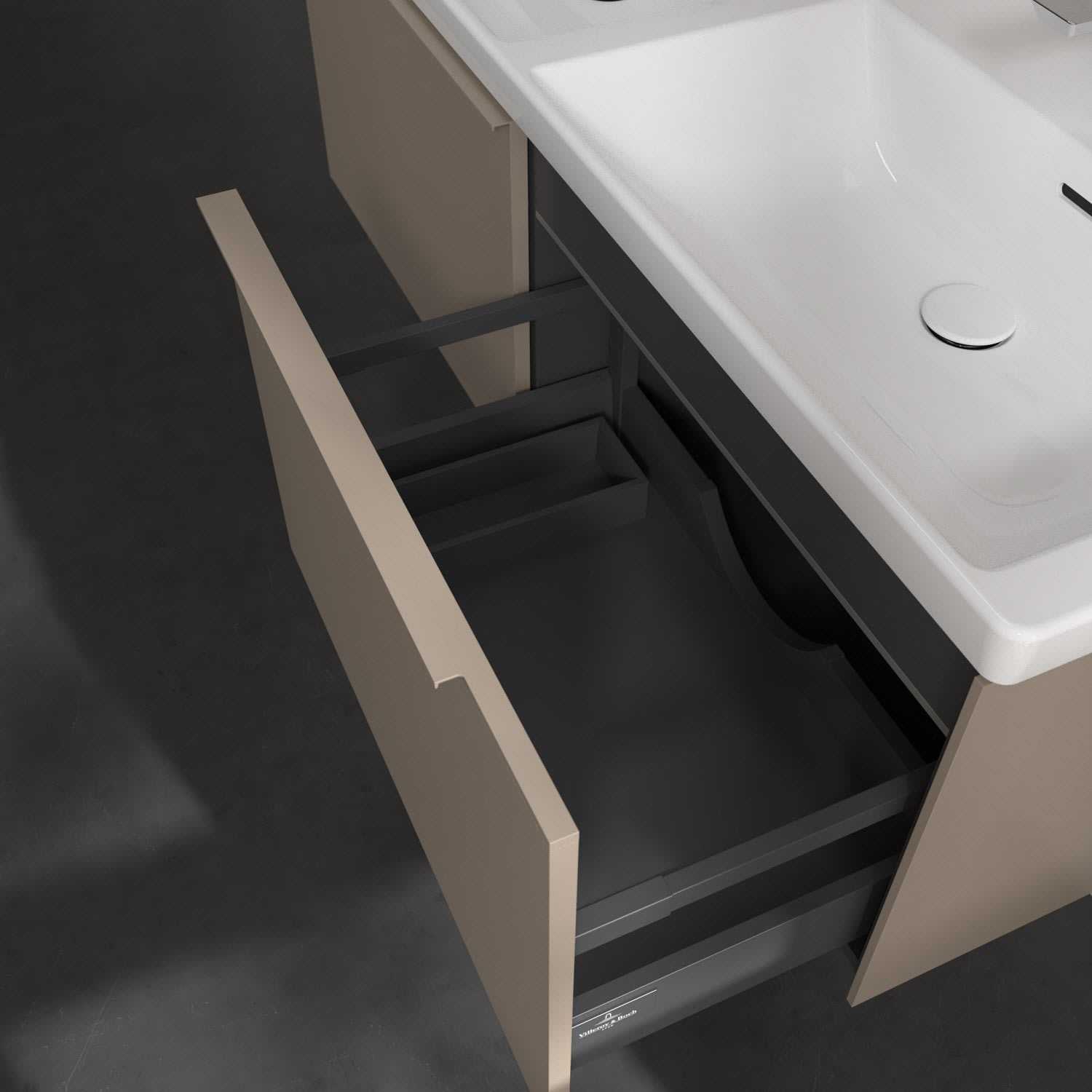 Der Waschtischunterschrank der Kollektion Subway 3.0 von Villeroy & Boch besticht durch gradliniges, zeitloses Design und großzügigen Stauraum. Front und Korpus sind mit einer hochwertigen Direktbeschichtung oder Lackierung, deren Anti-Fingerprint-Oberfläche unschönen Fingerabdrücken vorbeugt, versehen. Für eine einfache Handhabung sorgt eine dezente Griffleiste. Zwei voll ausziehbare Schubladen mit rutschhemmenden Böden, Selbsteinzug-Funktion und zwei integrierten kleinen Accessory-Boxen bieten besonders viel Platz für Pflege- und Hygieneartikel. Die beiden Auszüge sind mit einer funktionalen LED-Leiste ausgestattet, die mit neutralweißem Licht das Innenleben beleuchtet. Highlight ist die LED-Bodenbeleuchtung, die stimmungsvolles, sanftes Licht ins Bad bringt und nachts als Orientierungshilfe dient. Helligkeit und Lichtfarbe können über den kapazitiven Sensor eingestellt werden. Die LED-Leuchten lassen sich durch einen Fachhandwerker austauschen.