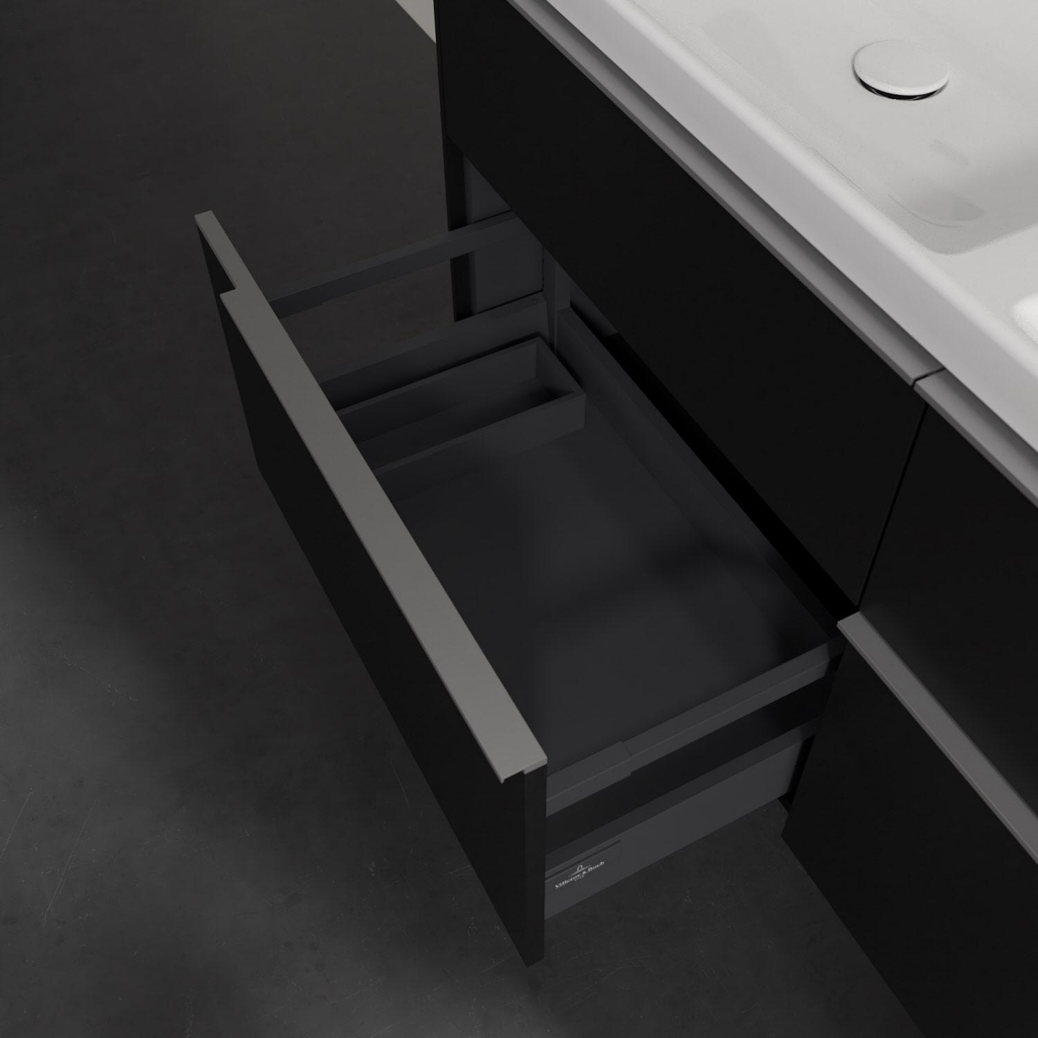 Der Waschtischunterschrank der Kollektion Subway 3.0 von Villeroy & Boch besticht durch gradliniges, zeitloses Design und großzügigen Stauraum. Front und Korpus sind mit einer hochwertigen Direktbeschichtung oder Lackierung, deren Anti-Fingerprint-Oberfläche unschönen Fingerabdrücken vorbeugt, versehen. Für eine einfache Handhabung sorgt eine dezente Griffleiste. Vier voll ausziehbare Schubladen mit rutschhemmenden Böden, Selbsteinzug-Funktion und zwei integrierten kleinen Accessory-Boxen bieten extra viel Platz für Pflege- und Hygieneartikel. Die beiden oberen Auszüge sind mit einer funktionalen LED-Leiste ausgestattet, die mit neutralweißem Licht das Innenleben beleuchtet. Highlight ist die LED-Bodenbeleuchtung, die stimmungsvolles, sanftes Licht ins Bad bringt und nachts als Orientierungshilfe dient. Helligkeit und Lichtfarbe können über den kapazitiven Sensor eingestellt werden. Die LED-Leuchten lassen sich durch einen Fachhandwerker austauschen.