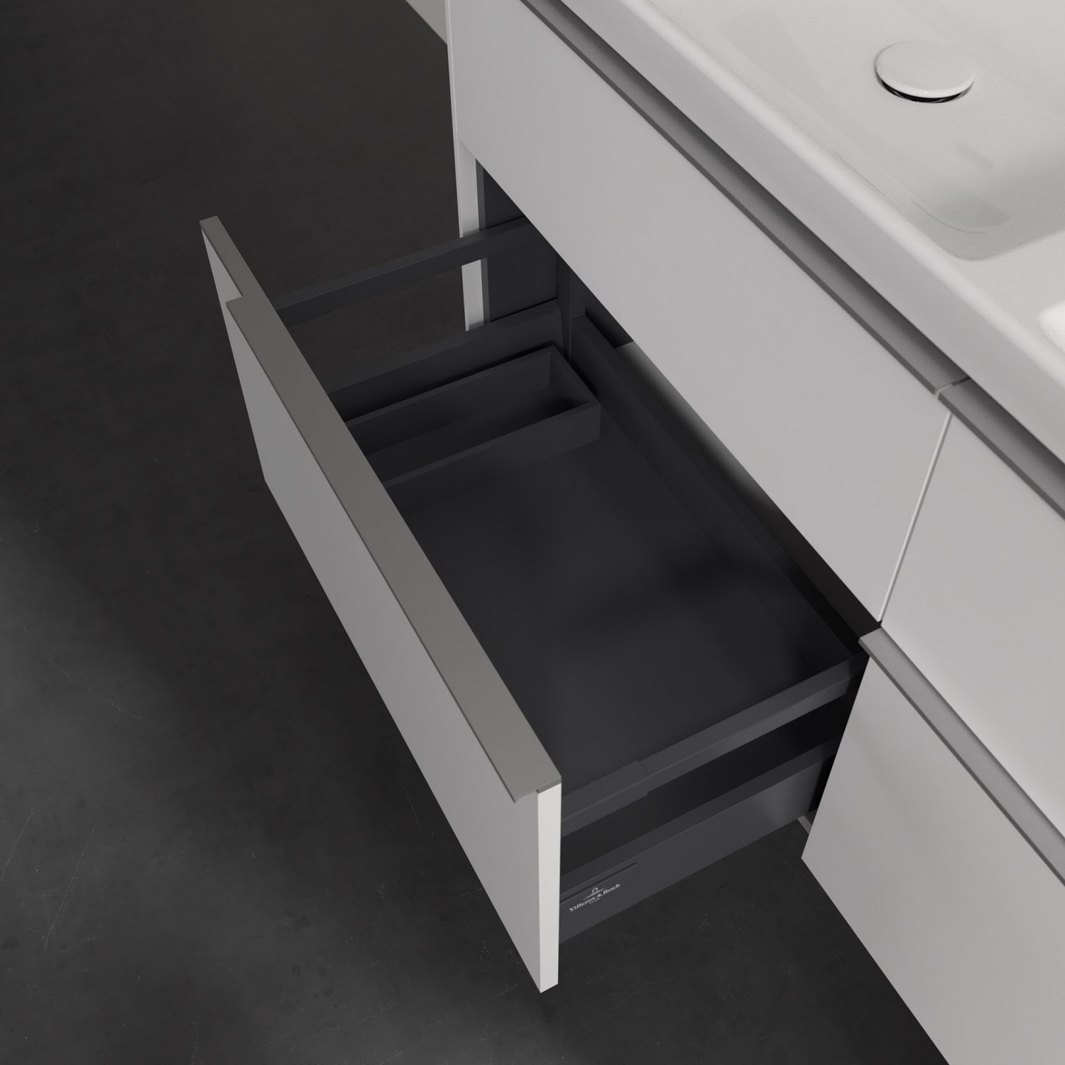 Der Waschtischunterschrank der Kollektion Subway 3.0 von Villeroy & Boch besticht durch gradliniges, zeitloses Design und großzügigen Stauraum. Front und Korpus sind mit einer hochwertigen Direktbeschichtung oder Lackierung, deren Anti-Fingerprint-Oberfläche unschönen Fingerabdrücken vorbeugt, versehen. Für eine einfache Handhabung sorgt eine dezente Griffleiste. Vier voll ausziehbare Schubladen mit rutschhemmenden Böden, Selbsteinzug-Funktion und zwei integrierten kleinen Accessory-Boxen bieten extra viel Platz für Pflege- und Hygieneartikel. Die beiden oberen Auszüge sind mit einer funktionalen LED-Leiste ausgestattet, die mit neutralweißem Licht das Innenleben beleuchtet. Highlight ist die LED-Bodenbeleuchtung, die stimmungsvolles, sanftes Licht ins Bad bringt und nachts als Orientierungshilfe dient. Helligkeit und Lichtfarbe können über den kapazitiven Sensor eingestellt werden. Die LED-Leuchten lassen sich durch einen Fachhandwerker austauschen.