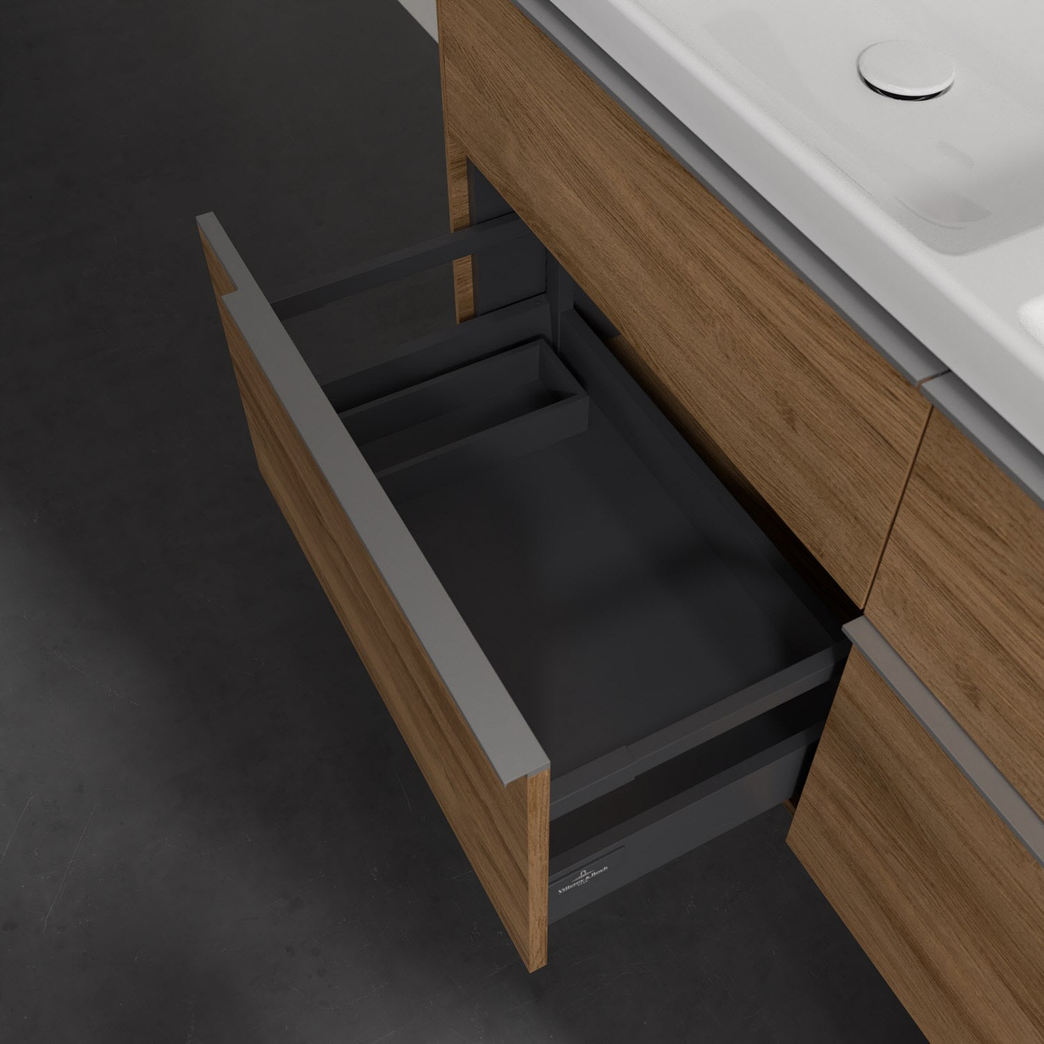 Der Waschtischunterschrank der Kollektion Subway 3.0 von Villeroy & Boch besticht durch gradliniges, zeitloses Design und großzügigen Stauraum. Front und Korpus sind mit einer hochwertigen Direktbeschichtung oder Lackierung, deren Anti-Fingerprint-Oberfläche unschönen Fingerabdrücken vorbeugt, versehen. Für eine einfache Handhabung sorgt eine dezente Griffleiste. Vier voll ausziehbare Schubladen mit rutschhemmenden Böden, Selbsteinzug-Funktion und zwei integrierten kleinen Accessory-Boxen bieten extra viel Platz für Pflege- und Hygieneartikel. Die beiden oberen Auszüge sind mit einer funktionalen LED-Leiste ausgestattet, die mit neutralweißem Licht das Innenleben beleuchtet. Highlight ist die LED-Bodenbeleuchtung, die stimmungsvolles, sanftes Licht ins Bad bringt und nachts als Orientierungshilfe dient. Helligkeit und Lichtfarbe können über den kapazitiven Sensor eingestellt werden. Die LED-Leuchten lassen sich durch einen Fachhandwerker austauschen.