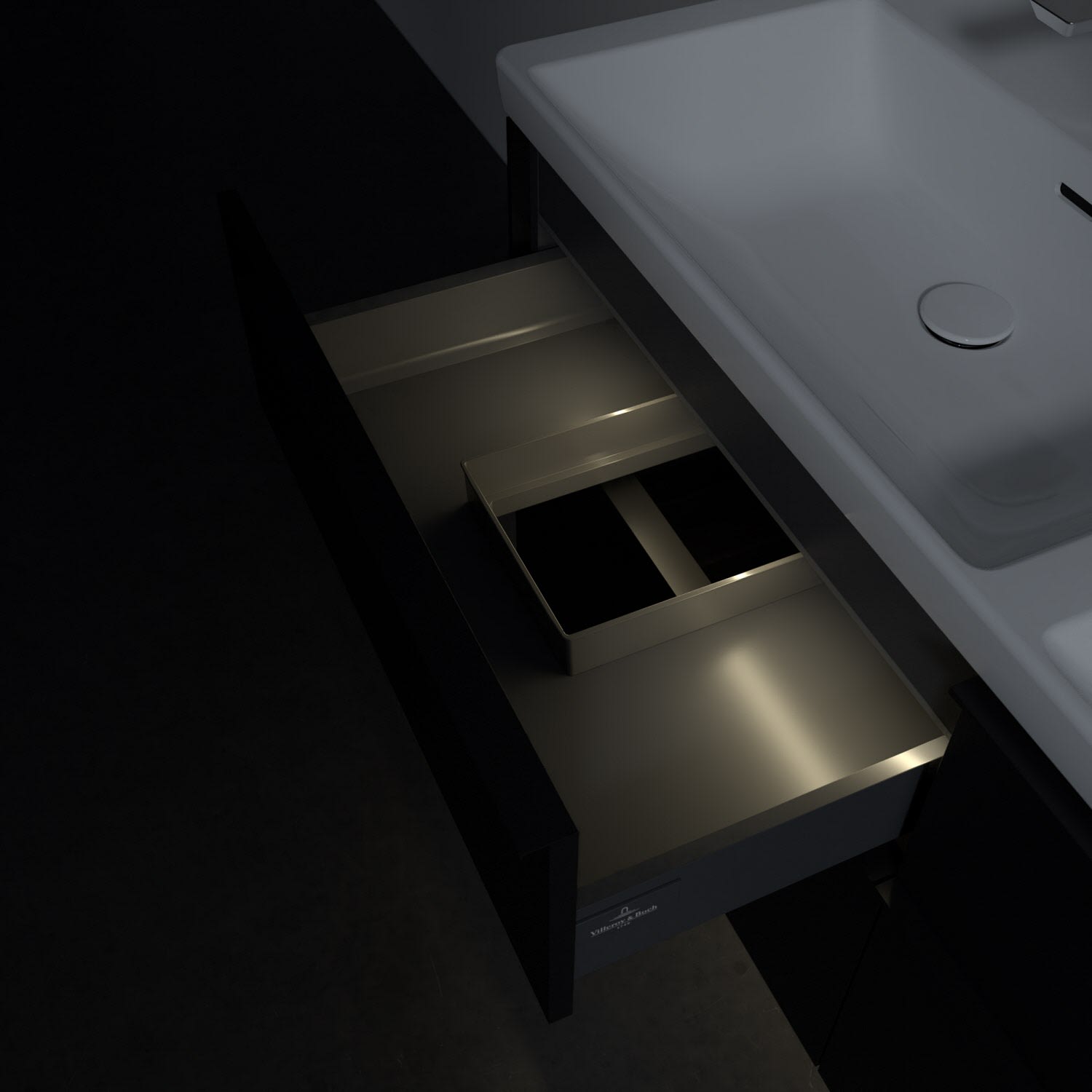 Der Waschtischunterschrank der Kollektion Subway 3.0 von Villeroy & Boch besticht durch gradliniges, zeitloses Design und großzügigen Stauraum. Front und Korpus sind mit einer hochwertigen Direktbeschichtung oder Lackierung, deren Anti-Fingerprint-Oberfläche unschönen Fingerabdrücken vorbeugt, versehen. Für eine einfache Handhabung sorgt eine dezente Griffleiste. Vier voll ausziehbare Schubladen mit rutschhemmenden Böden, Selbsteinzug-Funktion und zwei integrierten kleinen Accessory-Boxen bieten extra viel Platz für Pflege- und Hygieneartikel. Die beiden oberen Auszüge sind mit einer funktionalen LED-Leiste ausgestattet, die mit neutralweißem Licht das Innenleben beleuchtet. Highlight ist die LED-Bodenbeleuchtung, die stimmungsvolles, sanftes Licht ins Bad bringt und nachts als Orientierungshilfe dient. Helligkeit und Lichtfarbe können über den kapazitiven Sensor eingestellt werden. Die LED-Leuchten lassen sich durch einen Fachhandwerker austauschen.