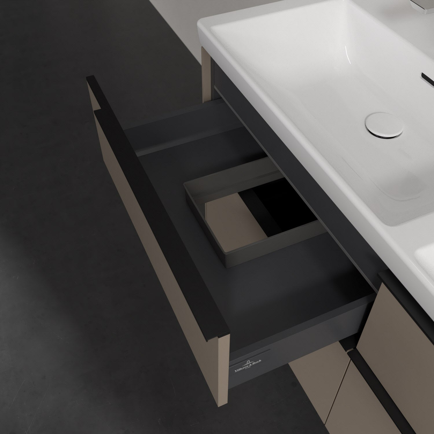 Der Waschtischunterschrank der Kollektion Subway 3.0 von Villeroy & Boch besticht durch gradliniges, zeitloses Design und großzügigen Stauraum. Front und Korpus sind mit einer hochwertigen Direktbeschichtung oder Lackierung, deren Anti-Fingerprint-Oberfläche unschönen Fingerabdrücken vorbeugt, versehen. Für eine einfache Handhabung sorgt eine dezente Griffleiste. Vier voll ausziehbare Schubladen mit rutschhemmenden Böden, Selbsteinzug-Funktion und zwei integrierten kleinen Accessory-Boxen bieten extra viel Platz für Pflege- und Hygieneartikel. Die beiden oberen Auszüge sind mit einer funktionalen LED-Leiste ausgestattet, die mit neutralweißem Licht das Innenleben beleuchtet. Highlight ist die LED-Bodenbeleuchtung, die stimmungsvolles, sanftes Licht ins Bad bringt und nachts als Orientierungshilfe dient. Helligkeit und Lichtfarbe können über den kapazitiven Sensor eingestellt werden. Die LED-Leuchten lassen sich durch einen Fachhandwerker austauschen.