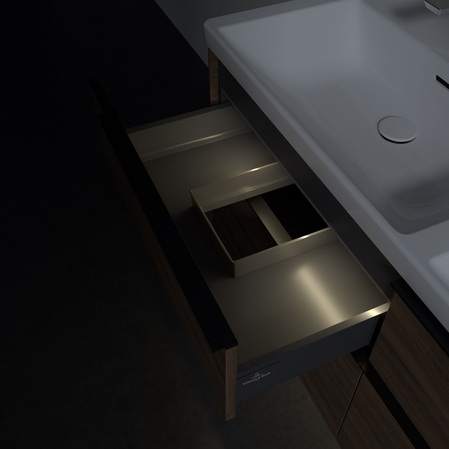Der Waschtischunterschrank der Kollektion Subway 3.0 von Villeroy & Boch besticht durch gradliniges, zeitloses Design und großzügigen Stauraum. Front und Korpus sind mit einer hochwertigen Direktbeschichtung oder Lackierung, deren Anti-Fingerprint-Oberfläche unschönen Fingerabdrücken vorbeugt, versehen. Für eine einfache Handhabung sorgt eine dezente Griffleiste. Vier voll ausziehbare Schubladen mit rutschhemmenden Böden, Selbsteinzug-Funktion und zwei integrierten kleinen Accessory-Boxen bieten extra viel Platz für Pflege- und Hygieneartikel. Die beiden oberen Auszüge sind mit einer funktionalen LED-Leiste ausgestattet, die mit neutralweißem Licht das Innenleben beleuchtet. Highlight ist die LED-Bodenbeleuchtung, die stimmungsvolles, sanftes Licht ins Bad bringt und nachts als Orientierungshilfe dient. Helligkeit und Lichtfarbe können über den kapazitiven Sensor eingestellt werden. Die LED-Leuchten lassen sich durch einen Fachhandwerker austauschen.