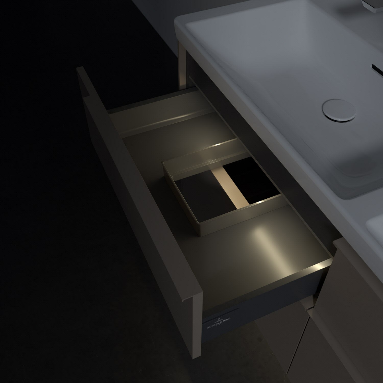 Der Waschtischunterschrank der Kollektion Subway 3.0 von Villeroy & Boch besticht durch gradliniges, zeitloses Design und großzügigen Stauraum. Front und Korpus sind mit einer hochwertigen Direktbeschichtung oder Lackierung, deren Anti-Fingerprint-Oberfläche unschönen Fingerabdrücken vorbeugt, versehen. Für eine einfache Handhabung sorgt eine dezente Griffleiste. Vier voll ausziehbare Schubladen mit rutschhemmenden Böden, Selbsteinzug-Funktion und zwei integrierten kleinen Accessory-Boxen bieten extra viel Platz für Pflege- und Hygieneartikel. Die beiden oberen Auszüge sind mit einer funktionalen LED-Leiste ausgestattet, die mit neutralweißem Licht das Innenleben beleuchtet. Highlight ist die LED-Bodenbeleuchtung, die stimmungsvolles, sanftes Licht ins Bad bringt und nachts als Orientierungshilfe dient. Helligkeit und Lichtfarbe können über den kapazitiven Sensor eingestellt werden. Die LED-Leuchten lassen sich durch einen Fachhandwerker austauschen.
