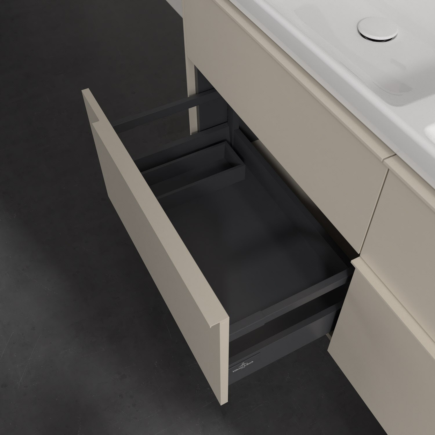 Der Waschtischunterschrank der Kollektion Subway 3.0 von Villeroy & Boch besticht durch gradliniges, zeitloses Design und großzügigen Stauraum. Front und Korpus sind mit einer hochwertigen Direktbeschichtung oder Lackierung, deren Anti-Fingerprint-Oberfläche unschönen Fingerabdrücken vorbeugt, versehen. Für eine einfache Handhabung sorgt eine dezente Griffleiste. Vier voll ausziehbare Schubladen mit rutschhemmenden Böden, Selbsteinzug-Funktion und zwei integrierten kleinen Accessory-Boxen bieten extra viel Platz für Pflege- und Hygieneartikel. Die beiden oberen Auszüge sind mit einer funktionalen LED-Leiste ausgestattet, die mit neutralweißem Licht das Innenleben beleuchtet. Highlight ist die LED-Bodenbeleuchtung, die stimmungsvolles, sanftes Licht ins Bad bringt und nachts als Orientierungshilfe dient. Helligkeit und Lichtfarbe können über den kapazitiven Sensor eingestellt werden. Die LED-Leuchten lassen sich durch einen Fachhandwerker austauschen.