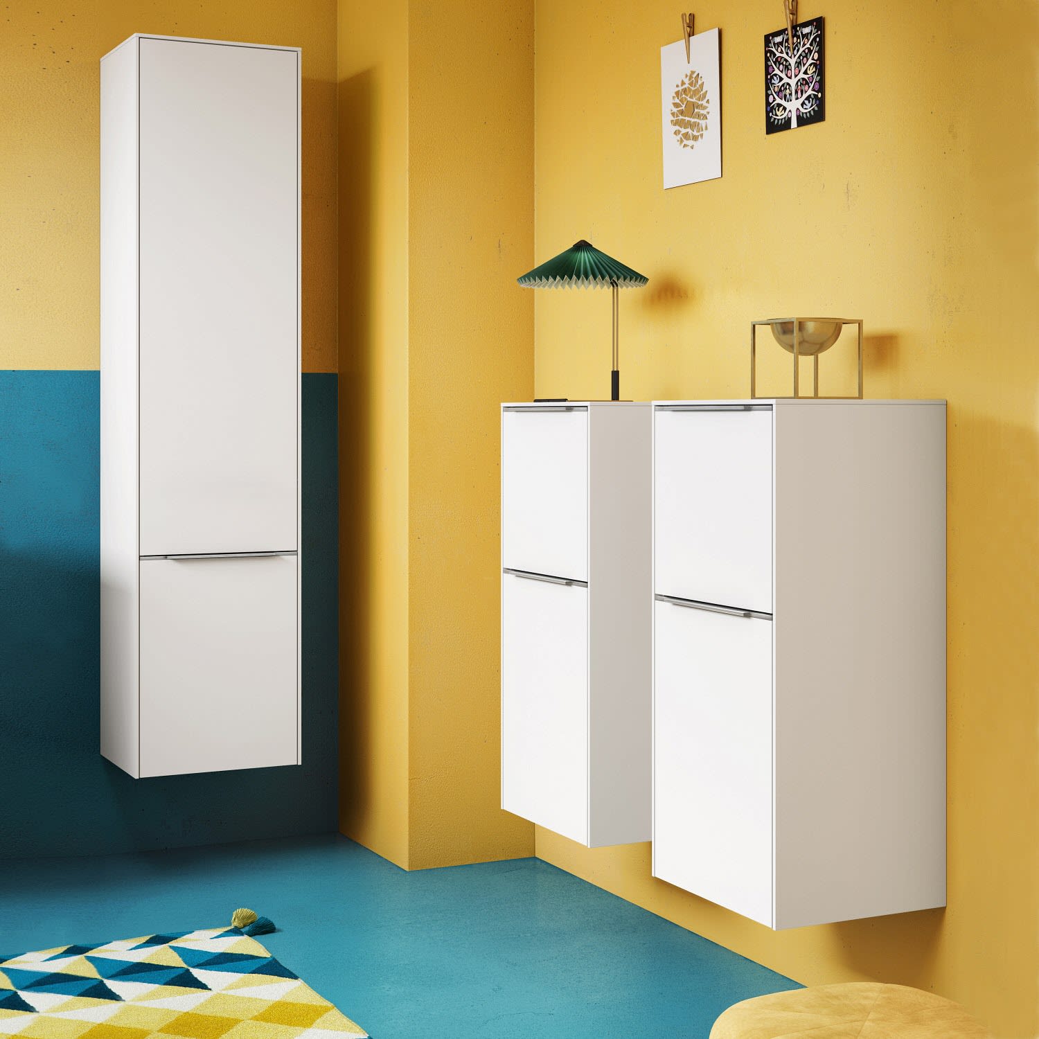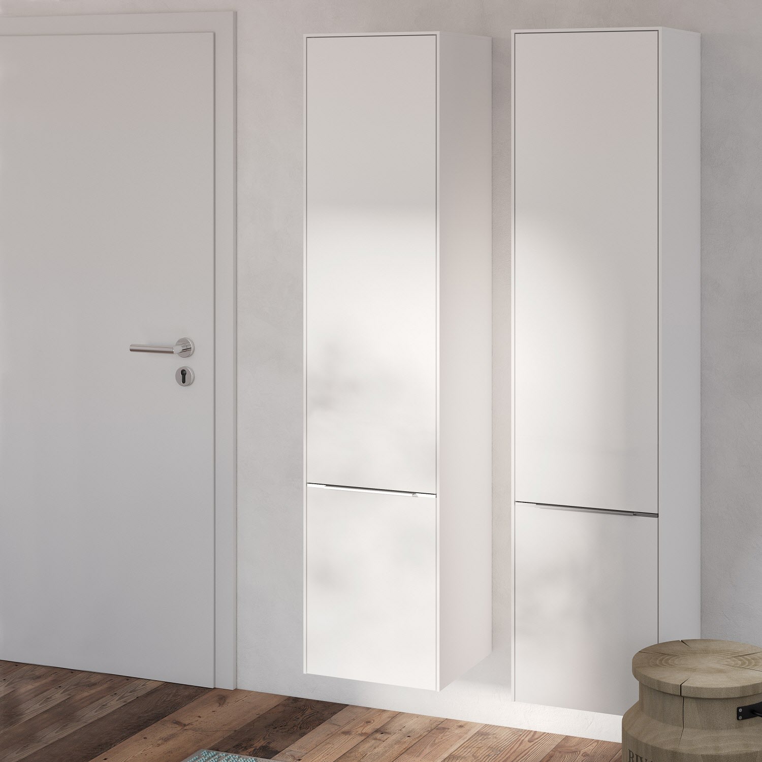 Der geschlossene Hochschrank der Kollektion Subway 3.0 von Villeroy & Boch zeigt sich gradlinig und zeitlos. Er ist die perfekte Ergänzung zum Waschtischunterschrank und bietet großzügigen Stauraum für Handtücher und andere Badutensilien. Front und Korpus sind mit einer hochwertigen Direktbeschichtung oder Lackierung, deren Anti-Fingerprint-Oberfläche unschönen Fingerabdrücken vorbeugt, versehen. Hinter den zwei nach links öffnenden Türen verbergen sich vier hochwertige Einlegeböden aus Glas und ein fester Fachboden. Während die obere Tür sich durch sanftes Tippen öffnen lässt, ist die untere Tür mit einer praktischen, dezenten Griffleiste ausgestattet.