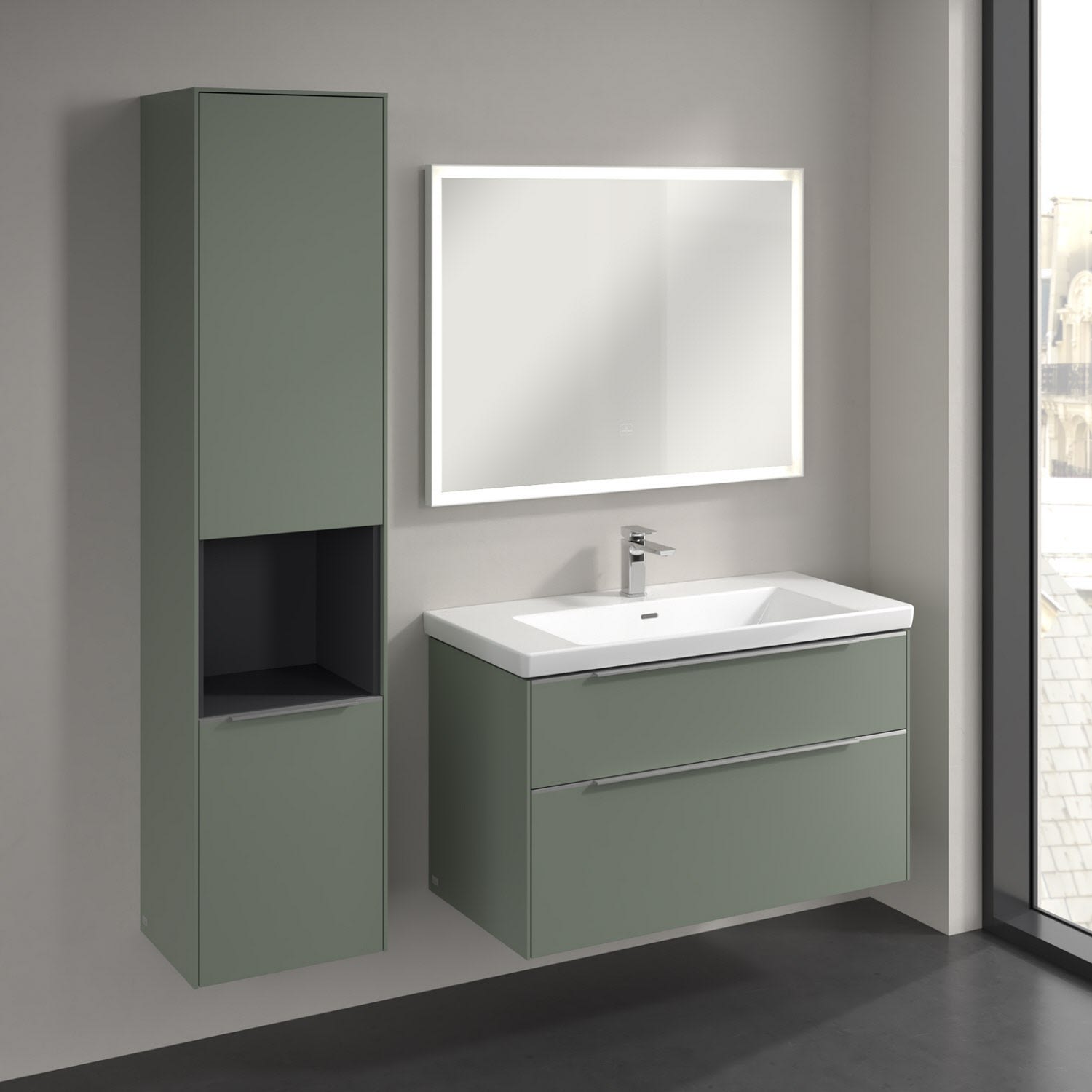 Der offene Hochschrank der Kollektion Subway 3.0 von Villeroy & Boch zeigt sich gradlinig und zeitlos. Er ist die perfekte Ergänzung zum Waschtischunterschrank und bietet großzügigen Stauraum. Front und Korpus sind mit einer hochwertigen Direktbeschichtung oder Lackierung, deren Anti-Fingerprint-Oberfläche unschönen Fingerabdrücken vorbeugt, versehen. Hinter den zwei nach links öffnenden Türen verbergen sich drei hochwertige Einlegeböden aus Glas und zwei feste Fachböden. Während die obere Tür sich durch sanftes Tippen öffnen lässt, ist die untere Tür mit einer praktischen, dezenten Griffleiste ausgestattet. Im offenen Fach in der Mitte können wichtige Badutensilien wie Handtücher verstaut werden, die so sofort griffbereit sind.