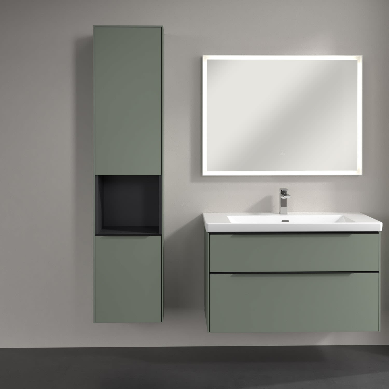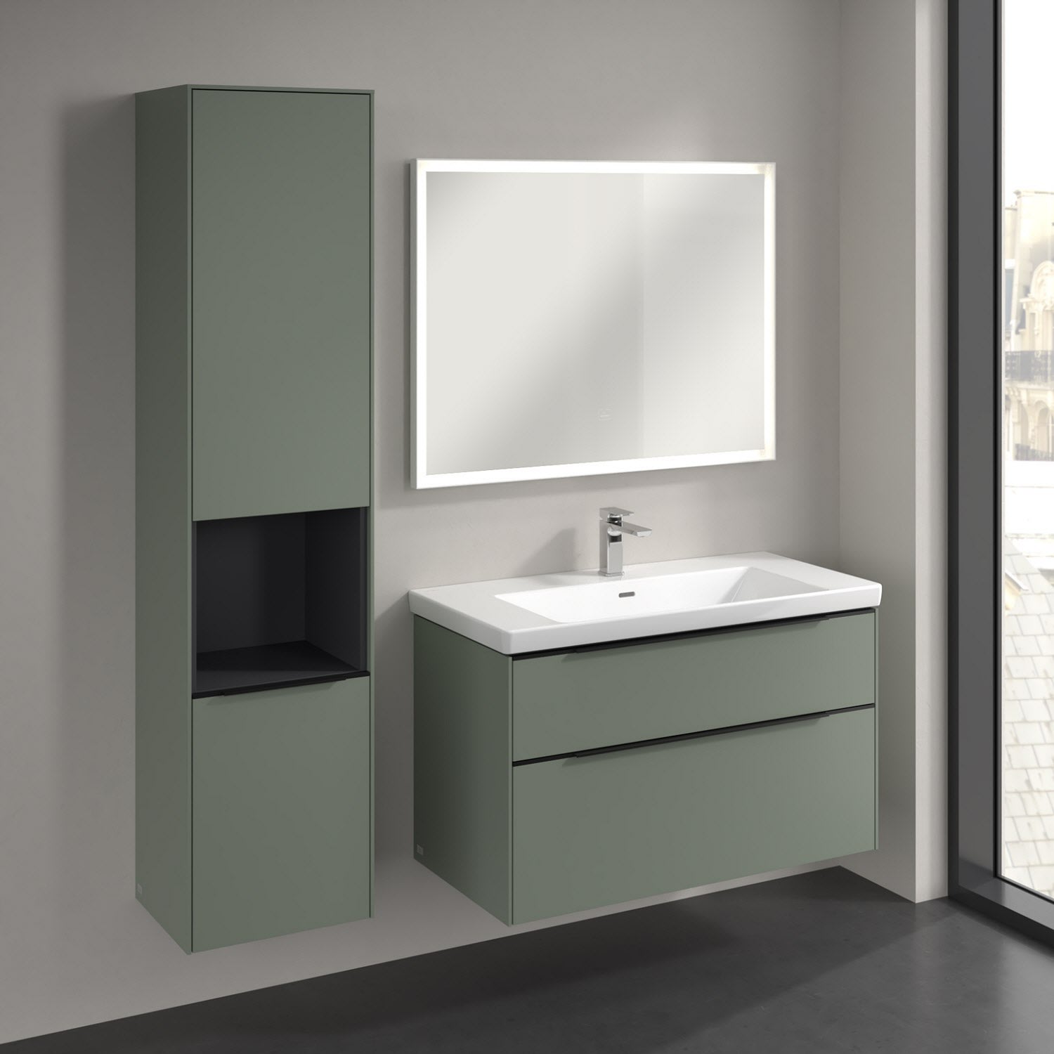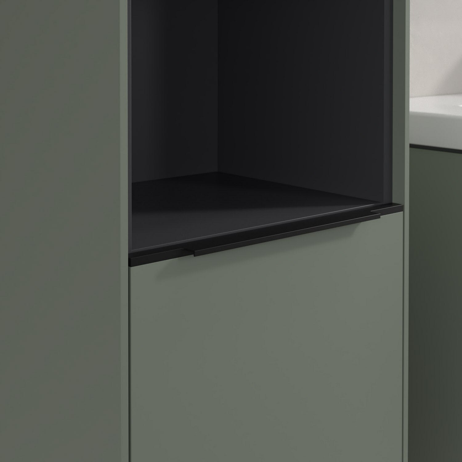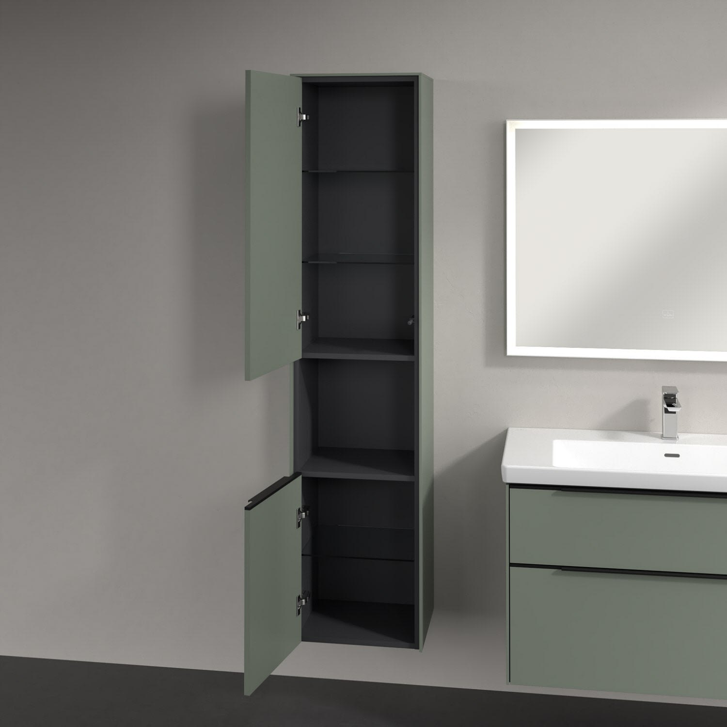 Der offene Hochschrank der Kollektion Subway 3.0 von Villeroy & Boch zeigt sich gradlinig und zeitlos. Er ist die perfekte Ergänzung zum Waschtischunterschrank und bietet großzügigen Stauraum. Front und Korpus sind mit einer hochwertigen Direktbeschichtung oder Lackierung, deren Anti-Fingerprint-Oberfläche unschönen Fingerabdrücken vorbeugt, versehen. Hinter den zwei nach links öffnenden Türen verbergen sich drei hochwertige Einlegeböden aus Glas und zwei feste Fachböden. Während die obere Tür sich durch sanftes Tippen öffnen lässt, ist die untere Tür mit einer praktischen, dezenten Griffleiste ausgestattet. Im offenen Fach in der Mitte können wichtige Badutensilien wie Handtücher verstaut werden, die so sofort griffbereit sind.