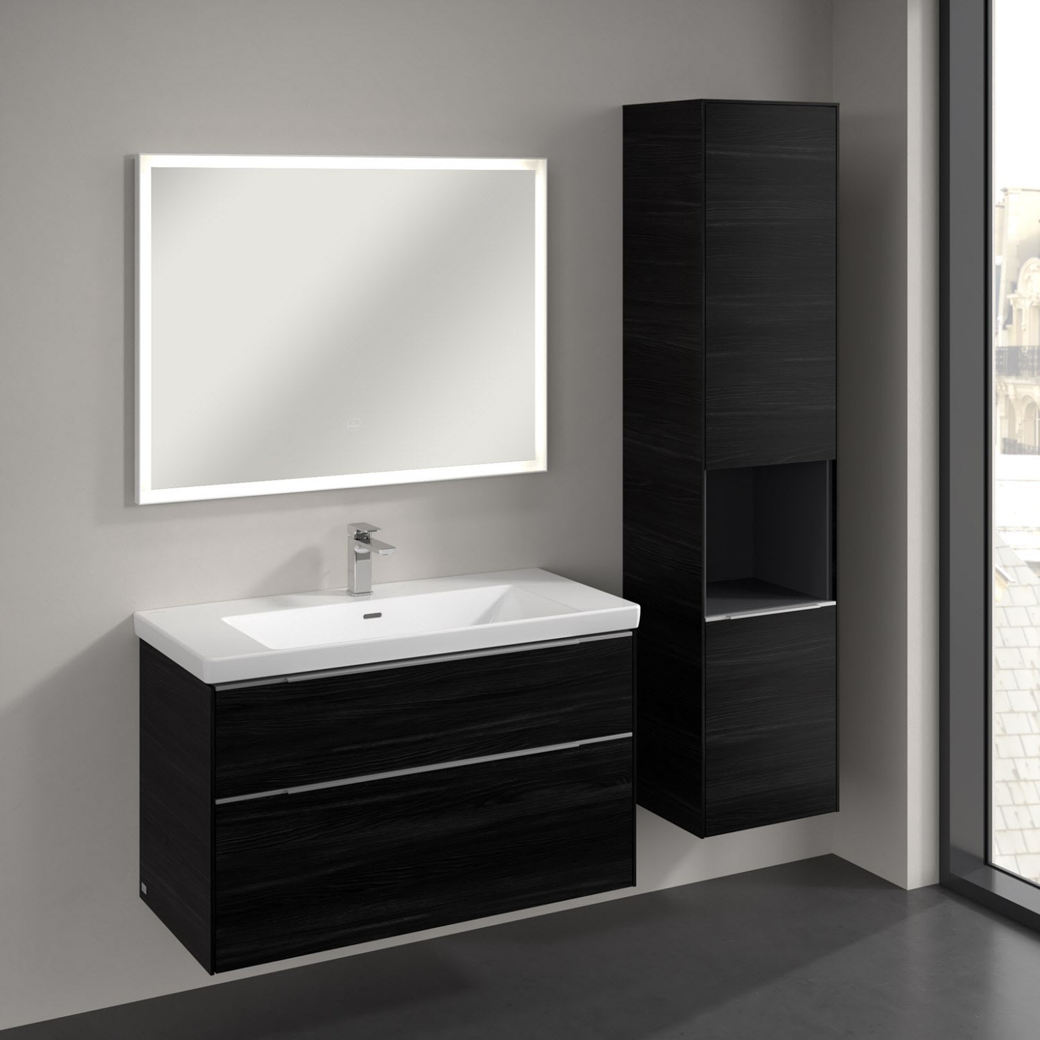 Der offene Hochschrank der Kollektion Subway 3.0 von Villeroy & Boch zeigt sich gradlinig und zeitlos. Er ist die perfekte Ergänzung zum Waschtischunterschrank und bietet großzügigen Stauraum. Front und Korpus sind mit einer hochwertigen Direktbeschichtung oder Lackierung, deren Anti-Fingerprint-Oberfläche unschönen Fingerabdrücken vorbeugt, versehen. Hinter den zwei nach rechts öffnenden Türen verbergen sich drei hochwertige Einlegeböden aus Glas und zwei feste Fachböden. Während die obere Tür sich durch sanftes Tippen öffnen lässt, ist die untere Tür mit einer praktischen, dezenten Griffleiste ausgestattet. Im offenen Fach in der Mitte können wichtige Badutensilien wie Handtücher verstaut werden, die so sofort griffbereit sind.