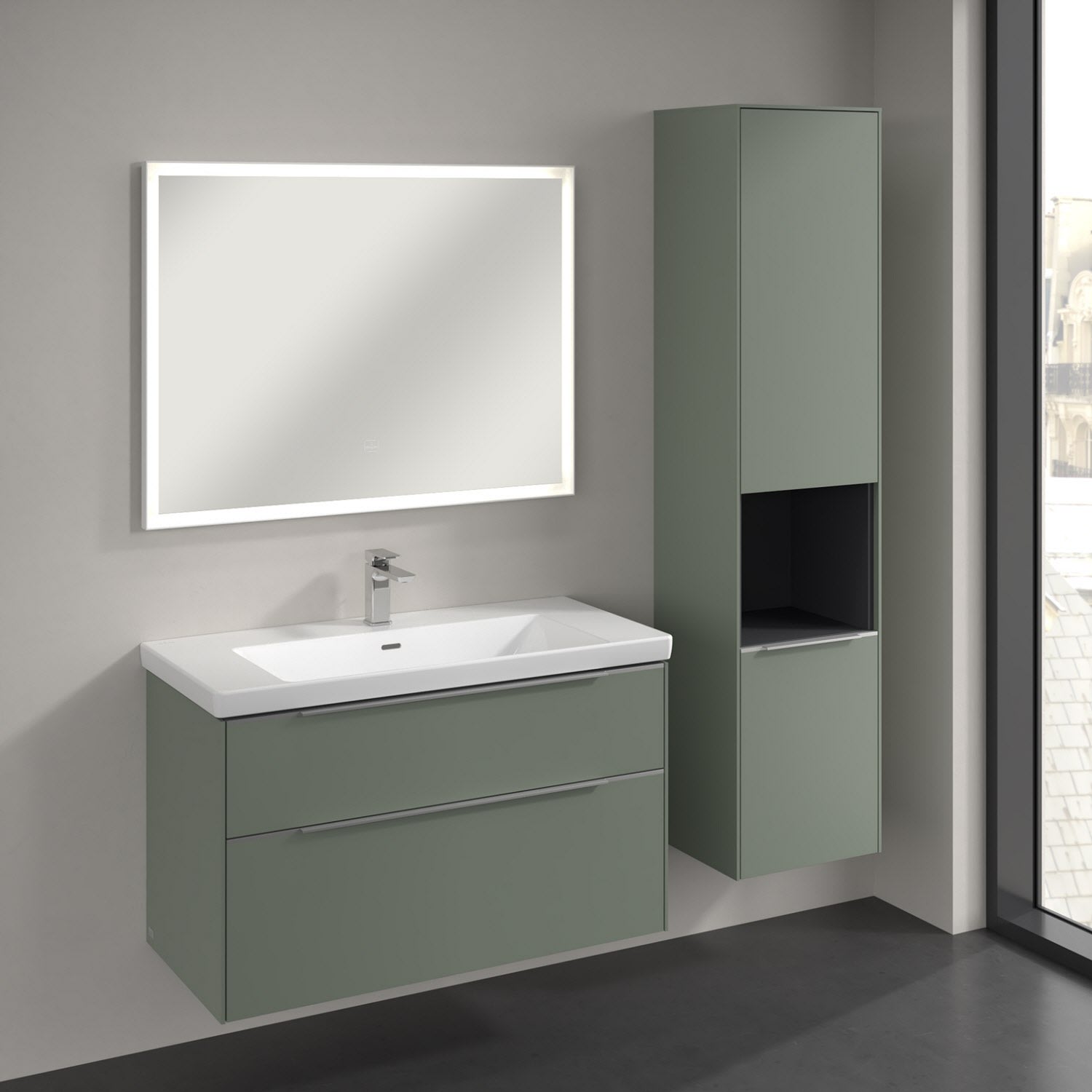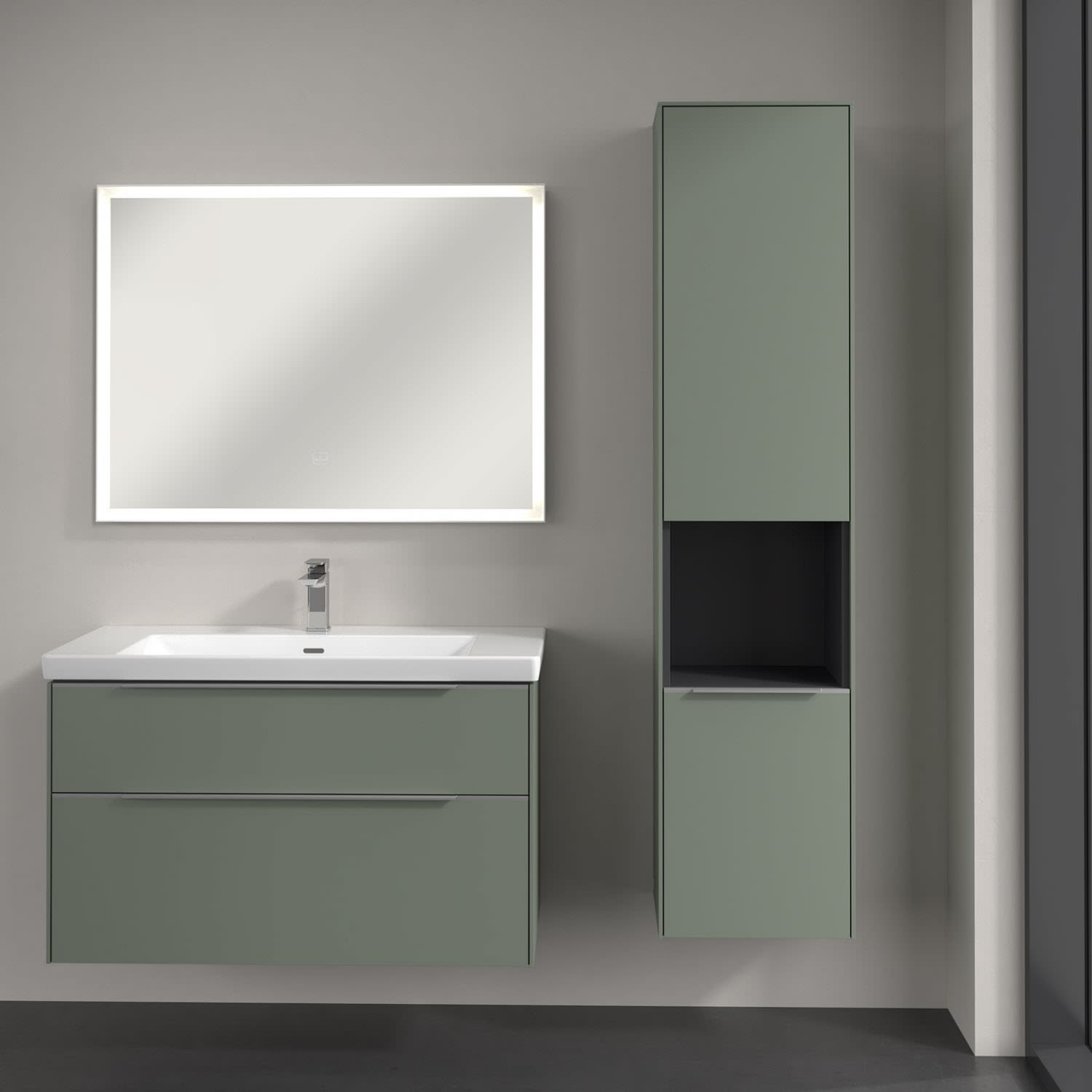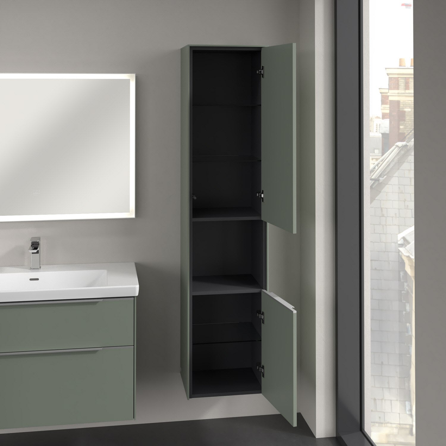 Der offene Hochschrank der Kollektion Subway 3.0 von Villeroy & Boch zeigt sich gradlinig und zeitlos. Er ist die perfekte Ergänzung zum Waschtischunterschrank und bietet großzügigen Stauraum. Front und Korpus sind mit einer hochwertigen Direktbeschichtung oder Lackierung, deren Anti-Fingerprint-Oberfläche unschönen Fingerabdrücken vorbeugt, versehen. Hinter den zwei nach rechts öffnenden Türen verbergen sich drei hochwertige Einlegeböden aus Glas und zwei feste Fachböden. Während die obere Tür sich durch sanftes Tippen öffnen lässt, ist die untere Tür mit einer praktischen, dezenten Griffleiste ausgestattet. Im offenen Fach in der Mitte können wichtige Badutensilien wie Handtücher verstaut werden, die so sofort griffbereit sind.