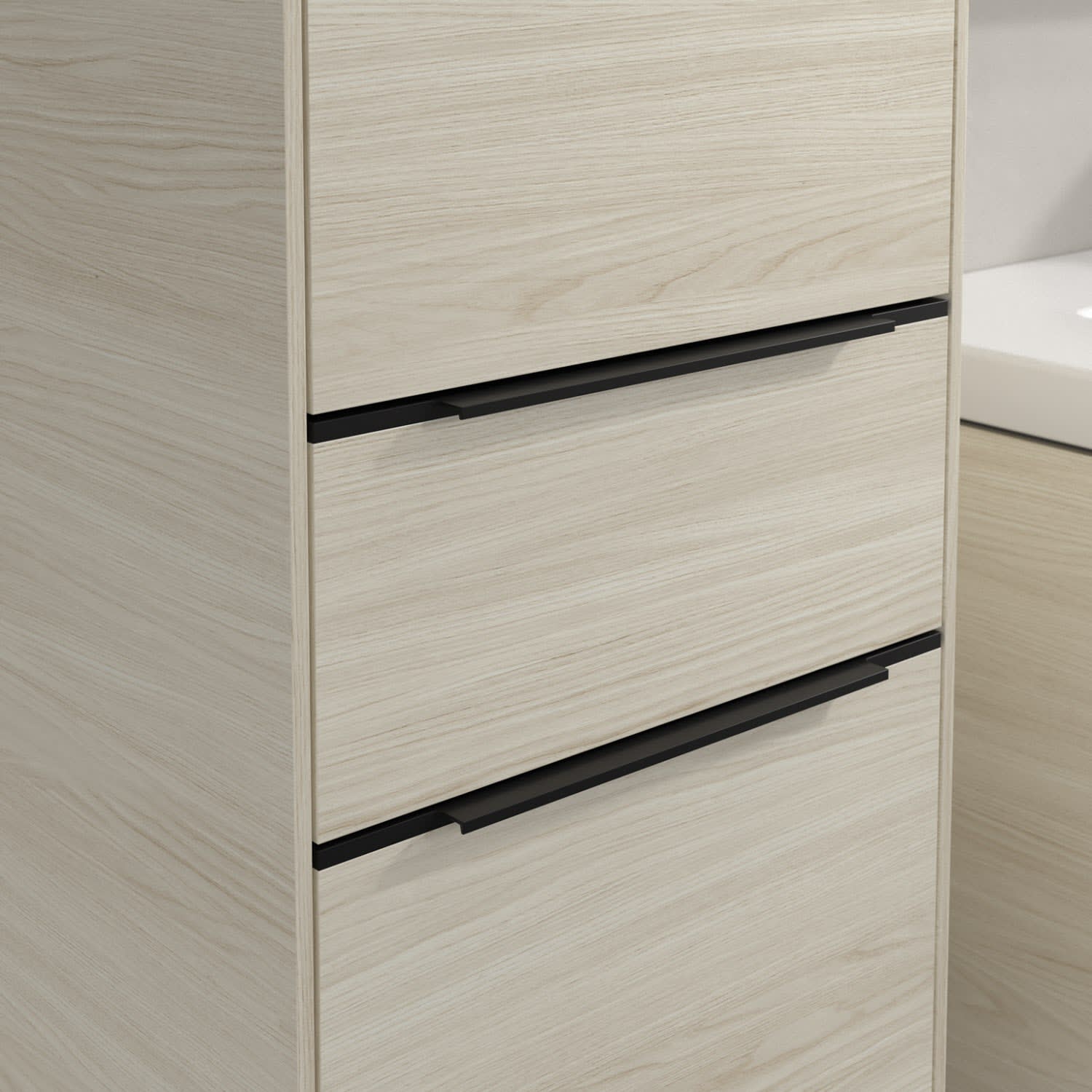 Der geschlossene Hochschrank der Kollektion Subway 3.0 von Villeroy & Boch zeigt sich gradlinig und zeitlos. Er ist die perfekte Ergänzung zum Waschtischunterschrank und bietet großzügigen Stauraum für Handtücher und andere Badutensilien. Front und Korpus sind mit einer hochwertigen Direktbeschichtung oder Lackierung, deren Anti-Fingerprint-Oberfläche unschönen Fingerabdrücken vorbeugt, versehen. Hinter den zwei nach links öffnenden Türen verbergen sich drei hochwertige Einlegeböden aus Glas und zwei feste Fachböden. Während die obere Tür sich durch sanftes Tippen öffnen lässt, ist die untere Tür mit einer praktischen, dezenten Griffleiste ausgestattet. In der Mitte befindet sich eine voll ausziehbare Schublade mit rutschhemmendem Boden und Selbsteinzug-Funktion. Dort können auch kleinere Utensilien übersichtlich verstaut werden.