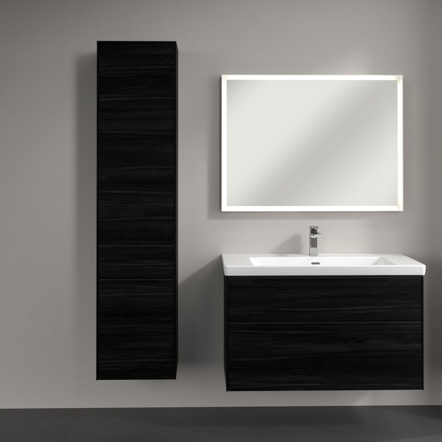 Der geschlossene Hochschrank der Kollektion Subway 3.0 von Villeroy & Boch zeigt sich gradlinig und zeitlos. Er ist die perfekte Ergänzung zum Waschtischunterschrank und bietet großzügigen Stauraum für Handtücher und andere Badutensilien. Front und Korpus sind mit einer hochwertigen Direktbeschichtung oder Lackierung, deren Anti-Fingerprint-Oberfläche unschönen Fingerabdrücken vorbeugt, versehen. Hinter den zwei nach links öffnenden Türen verbergen sich drei hochwertige Einlegeböden aus Glas und zwei feste Fachböden. Während die obere Tür sich durch sanftes Tippen öffnen lässt, ist die untere Tür mit einer praktischen, dezenten Griffleiste ausgestattet. In der Mitte befindet sich eine voll ausziehbare Schublade mit rutschhemmendem Boden und Selbsteinzug-Funktion. Dort können auch kleinere Utensilien übersichtlich verstaut werden.