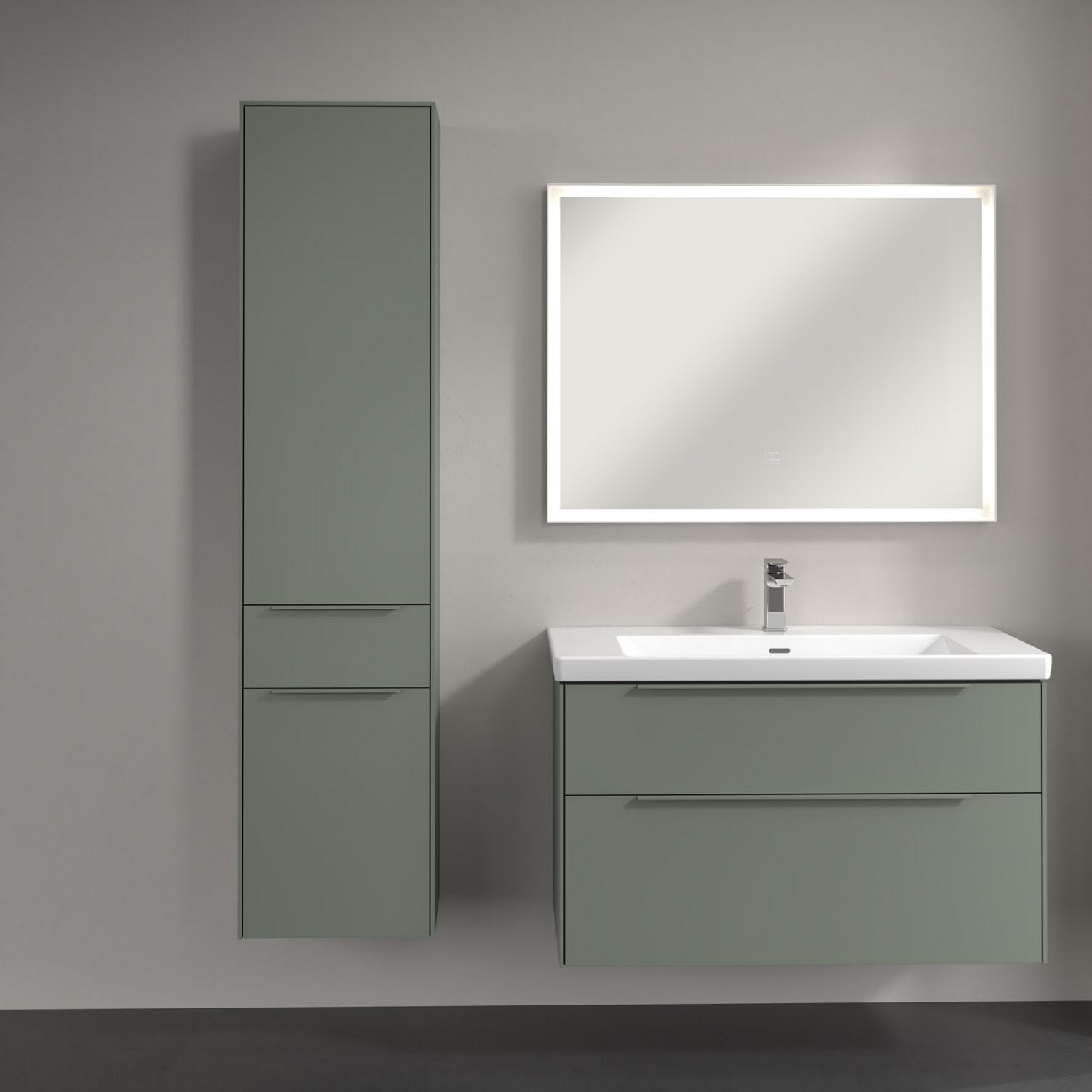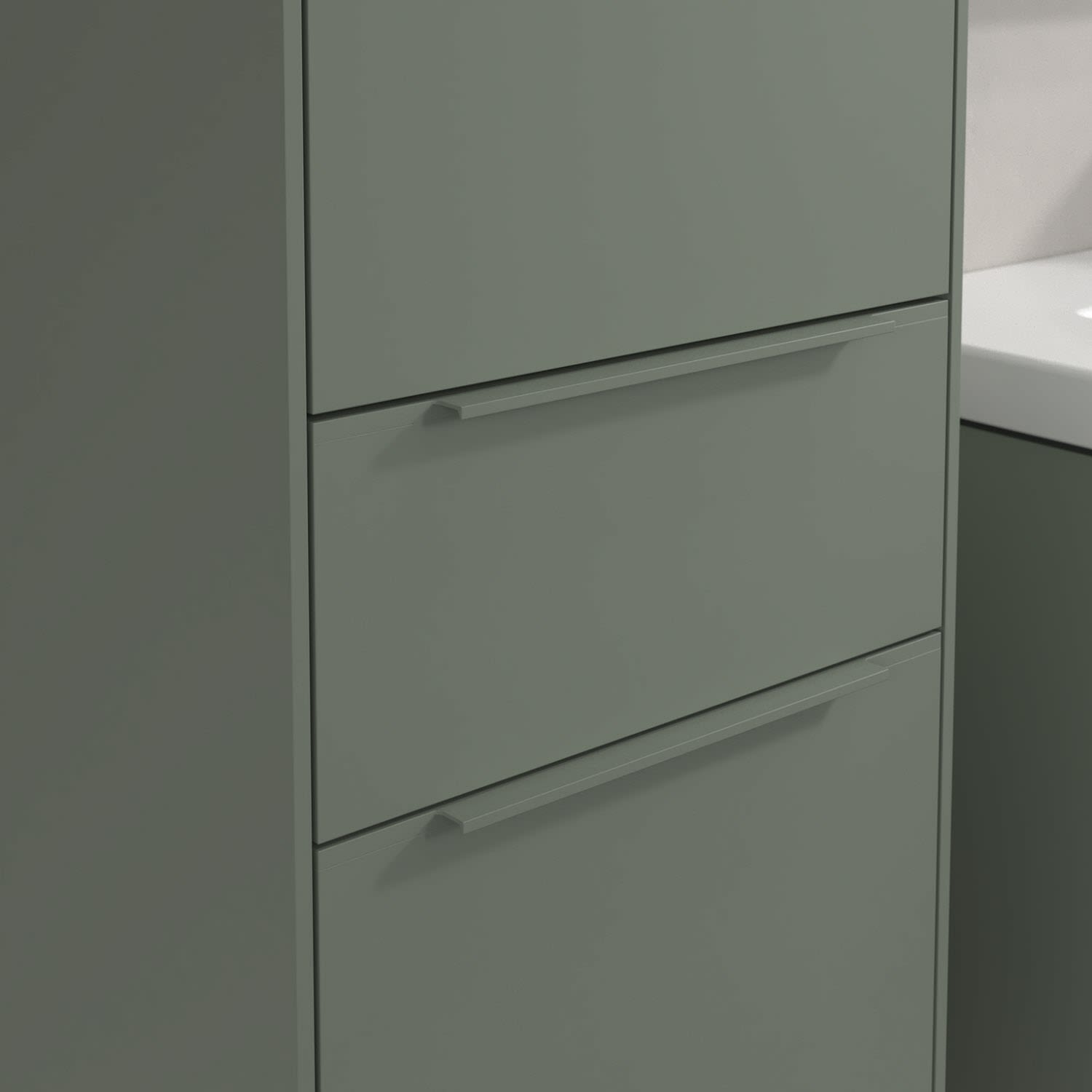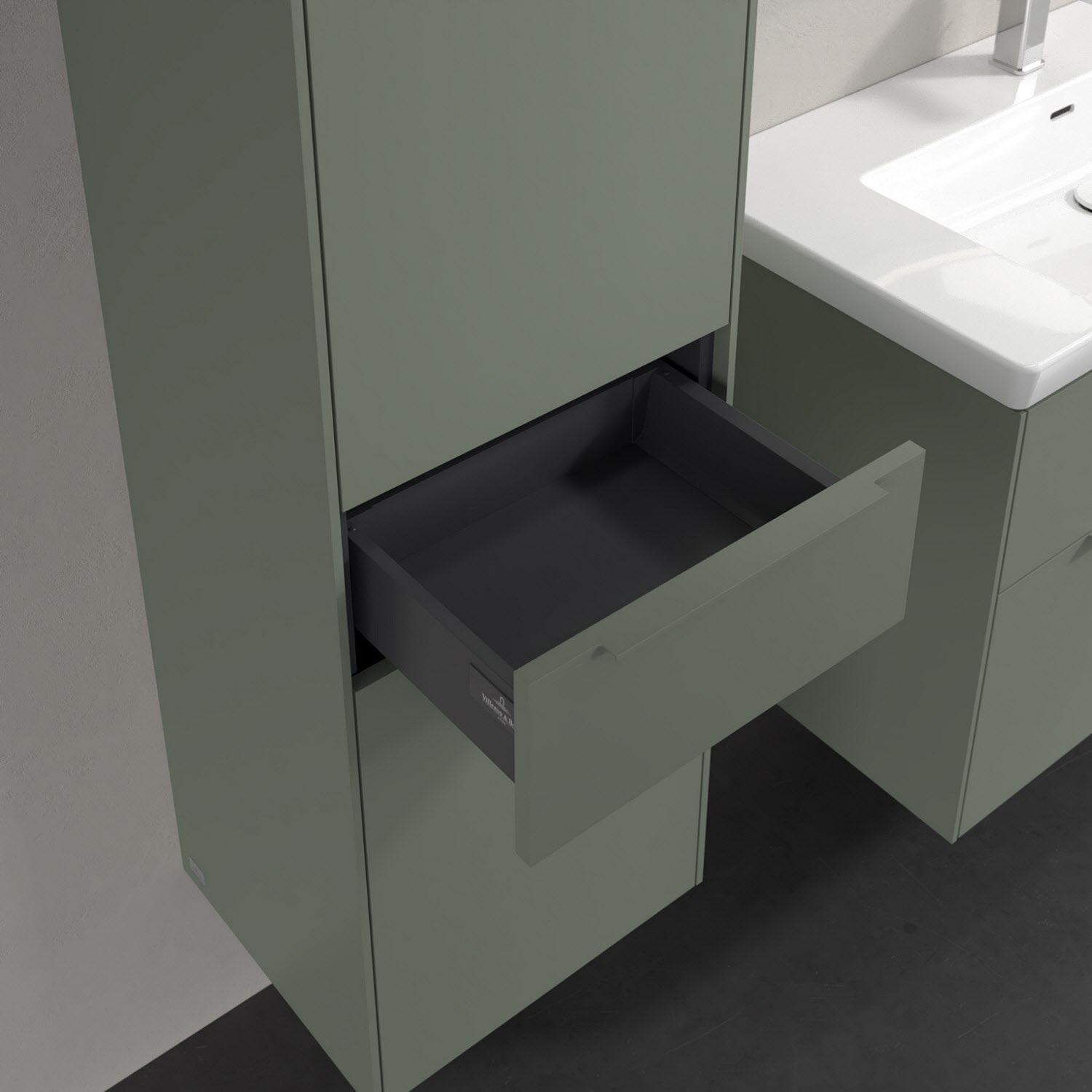 Der geschlossene Hochschrank der Kollektion Subway 3.0 von Villeroy & Boch zeigt sich gradlinig und zeitlos. Er ist die perfekte Ergänzung zum Waschtischunterschrank und bietet großzügigen Stauraum für Handtücher und andere Badutensilien. Front und Korpus sind mit einer hochwertigen Direktbeschichtung oder Lackierung, deren Anti-Fingerprint-Oberfläche unschönen Fingerabdrücken vorbeugt, versehen. Hinter den zwei nach links öffnenden Türen verbergen sich drei hochwertige Einlegeböden aus Glas und zwei feste Fachböden. Während die obere Tür sich durch sanftes Tippen öffnen lässt, ist die untere Tür mit einer praktischen, dezenten Griffleiste ausgestattet. In der Mitte befindet sich eine voll ausziehbare Schublade mit rutschhemmendem Boden und Selbsteinzug-Funktion. Dort können auch kleinere Utensilien übersichtlich verstaut werden.