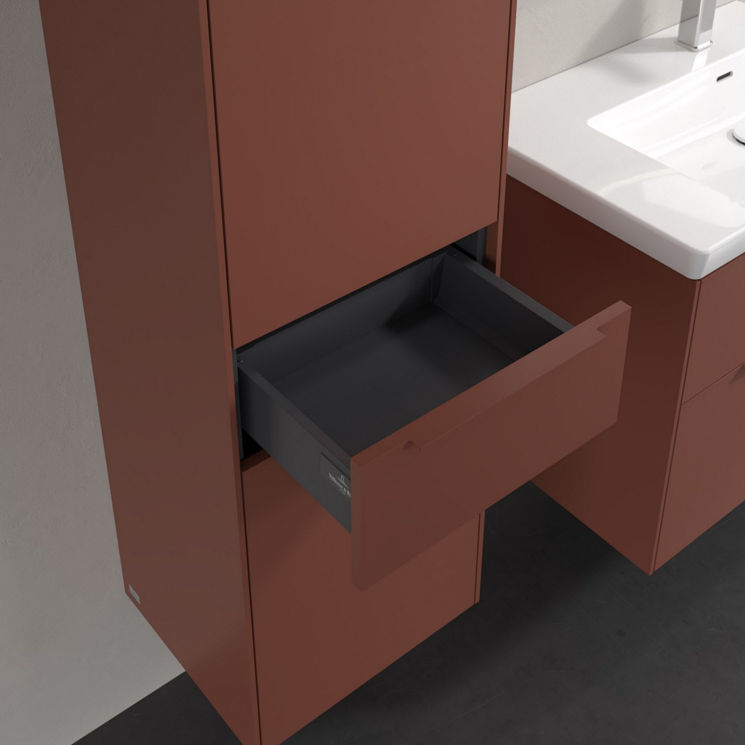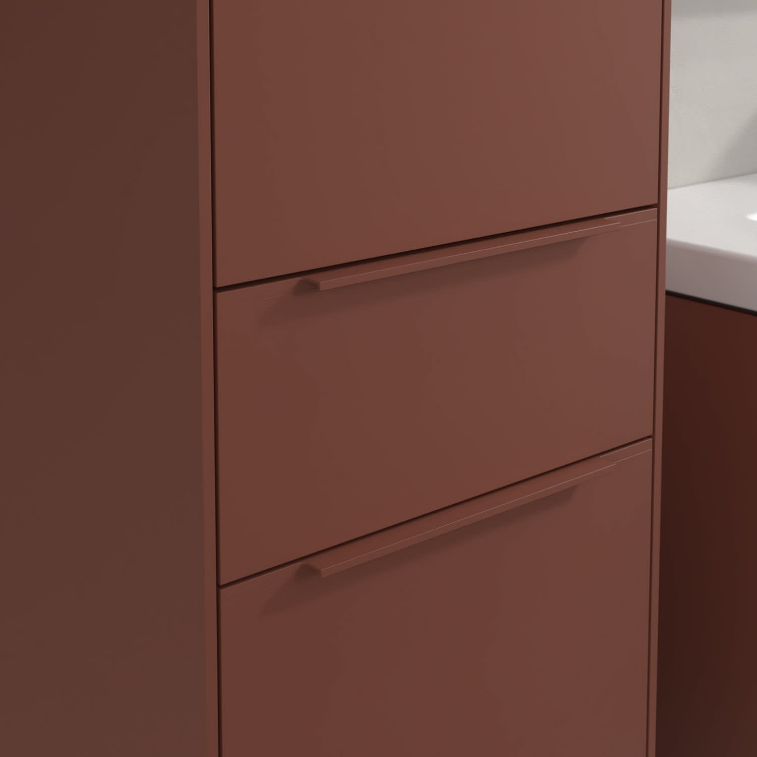 Der geschlossene Hochschrank der Kollektion Subway 3.0 von Villeroy & Boch zeigt sich gradlinig und zeitlos. Er ist die perfekte Ergänzung zum Waschtischunterschrank und bietet großzügigen Stauraum für Handtücher und andere Badutensilien. Front und Korpus sind mit einer hochwertigen Direktbeschichtung oder Lackierung, deren Anti-Fingerprint-Oberfläche unschönen Fingerabdrücken vorbeugt, versehen. Hinter den zwei nach links öffnenden Türen verbergen sich drei hochwertige Einlegeböden aus Glas und zwei feste Fachböden. Während die obere Tür sich durch sanftes Tippen öffnen lässt, ist die untere Tür mit einer praktischen, dezenten Griffleiste ausgestattet. In der Mitte befindet sich eine voll ausziehbare Schublade mit rutschhemmendem Boden und Selbsteinzug-Funktion. Dort können auch kleinere Utensilien übersichtlich verstaut werden.