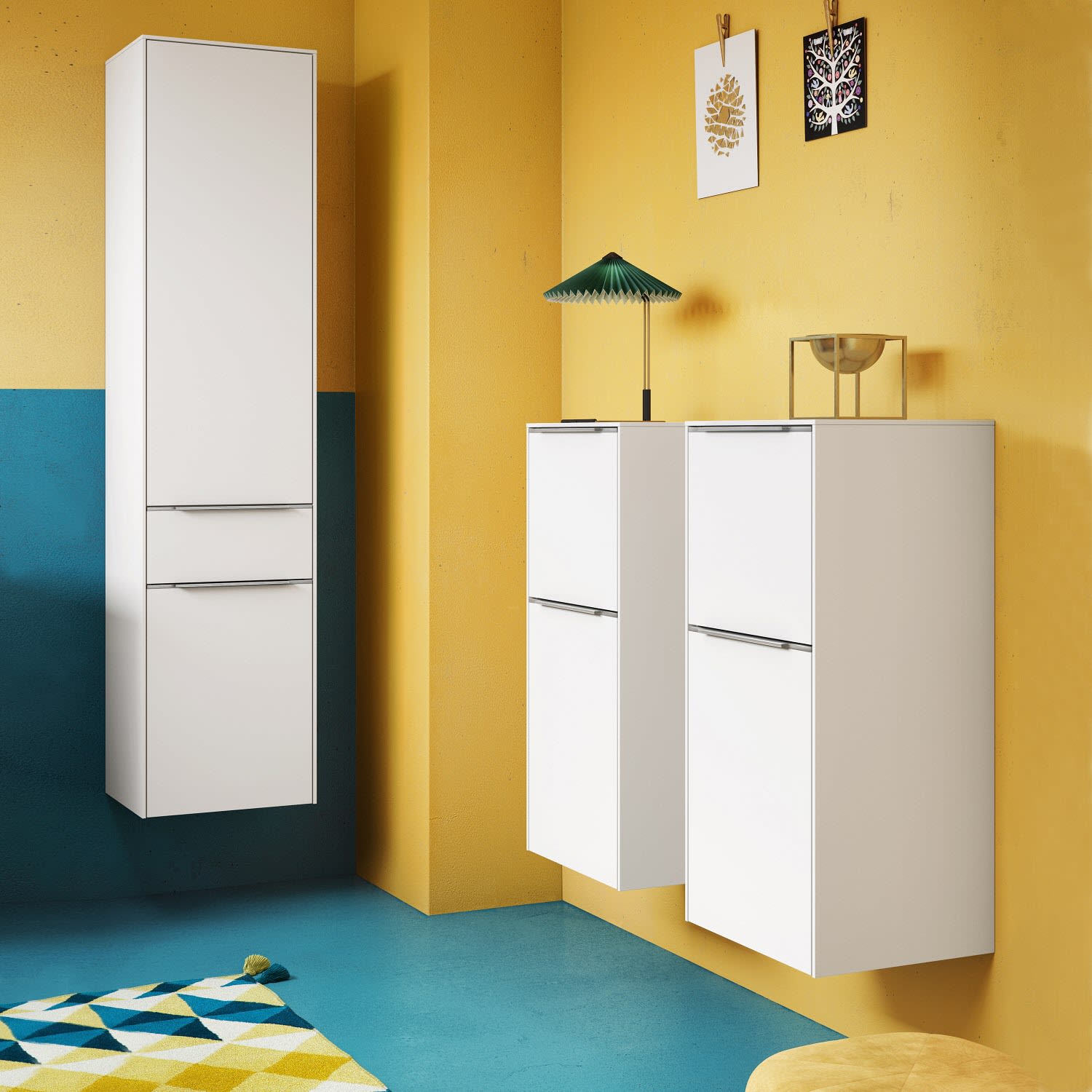 Der geschlossene Hochschrank der Kollektion Subway 3.0 von Villeroy & Boch zeigt sich gradlinig und zeitlos. Er ist die perfekte Ergänzung zum Waschtischunterschrank und bietet großzügigen Stauraum für Handtücher und andere Badutensilien. Front und Korpus sind mit einer hochwertigen Direktbeschichtung oder Lackierung, deren Anti-Fingerprint-Oberfläche unschönen Fingerabdrücken vorbeugt, versehen. Hinter den zwei nach rechts öffnenden Türen verbergen sich drei hochwertige Einlegeböden aus Glas und zwei feste Fachböden. Während die obere Tür sich durch sanftes Tippen öffnen lässt, ist die untere Tür mit einer praktischen, dezenten Griffleiste ausgestattet. In der Mitte befindet sich eine voll ausziehbare Schublade mit rutschhemmendem Boden und Selbsteinzug-Funktion. Dort können auch kleinere Utensilien übersichtlich verstaut werden.