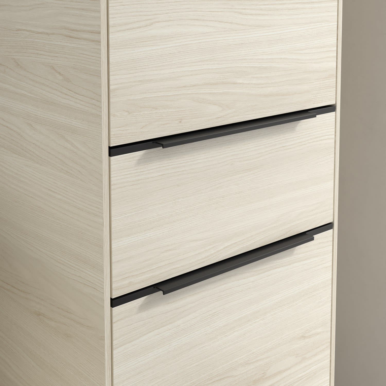 Der geschlossene Hochschrank der Kollektion Subway 3.0 von Villeroy & Boch zeigt sich gradlinig und zeitlos. Er ist die perfekte Ergänzung zum Waschtischunterschrank und bietet großzügigen Stauraum für Handtücher und andere Badutensilien. Front und Korpus sind mit einer hochwertigen Direktbeschichtung oder Lackierung, deren Anti-Fingerprint-Oberfläche unschönen Fingerabdrücken vorbeugt, versehen. Hinter den zwei nach rechts öffnenden Türen verbergen sich drei hochwertige Einlegeböden aus Glas und zwei feste Fachböden. Während die obere Tür sich durch sanftes Tippen öffnen lässt, ist die untere Tür mit einer praktischen, dezenten Griffleiste ausgestattet. In der Mitte befindet sich eine voll ausziehbare Schublade mit rutschhemmendem Boden und Selbsteinzug-Funktion. Dort können auch kleinere Utensilien übersichtlich verstaut werden.
