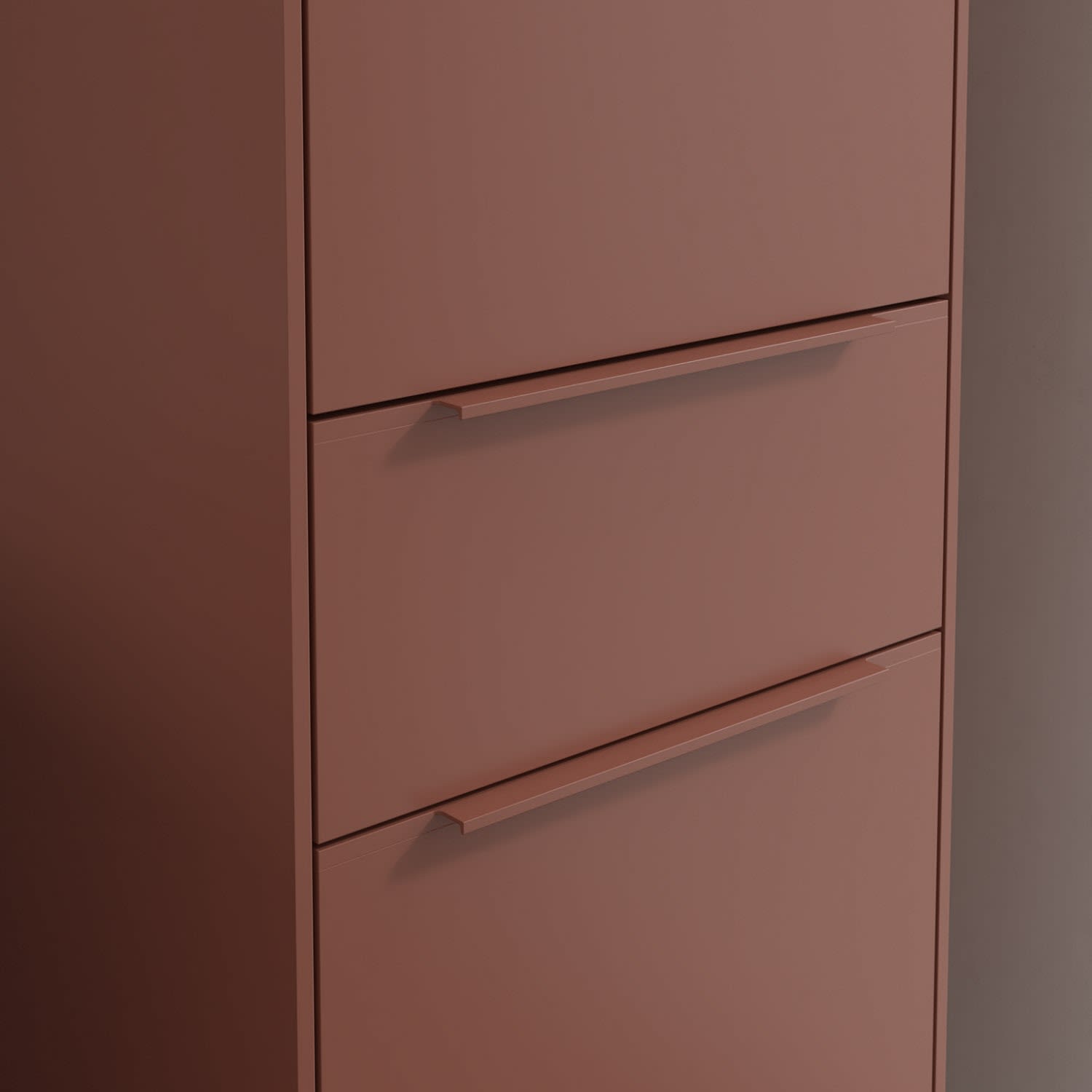 Der geschlossene Hochschrank der Kollektion Subway 3.0 von Villeroy & Boch zeigt sich gradlinig und zeitlos. Er ist die perfekte Ergänzung zum Waschtischunterschrank und bietet großzügigen Stauraum für Handtücher und andere Badutensilien. Front und Korpus sind mit einer hochwertigen Direktbeschichtung oder Lackierung, deren Anti-Fingerprint-Oberfläche unschönen Fingerabdrücken vorbeugt, versehen. Hinter den zwei nach rechts öffnenden Türen verbergen sich drei hochwertige Einlegeböden aus Glas und zwei feste Fachböden. Während die obere Tür sich durch sanftes Tippen öffnen lässt, ist die untere Tür mit einer praktischen, dezenten Griffleiste ausgestattet. In der Mitte befindet sich eine voll ausziehbare Schublade mit rutschhemmendem Boden und Selbsteinzug-Funktion. Dort können auch kleinere Utensilien übersichtlich verstaut werden.