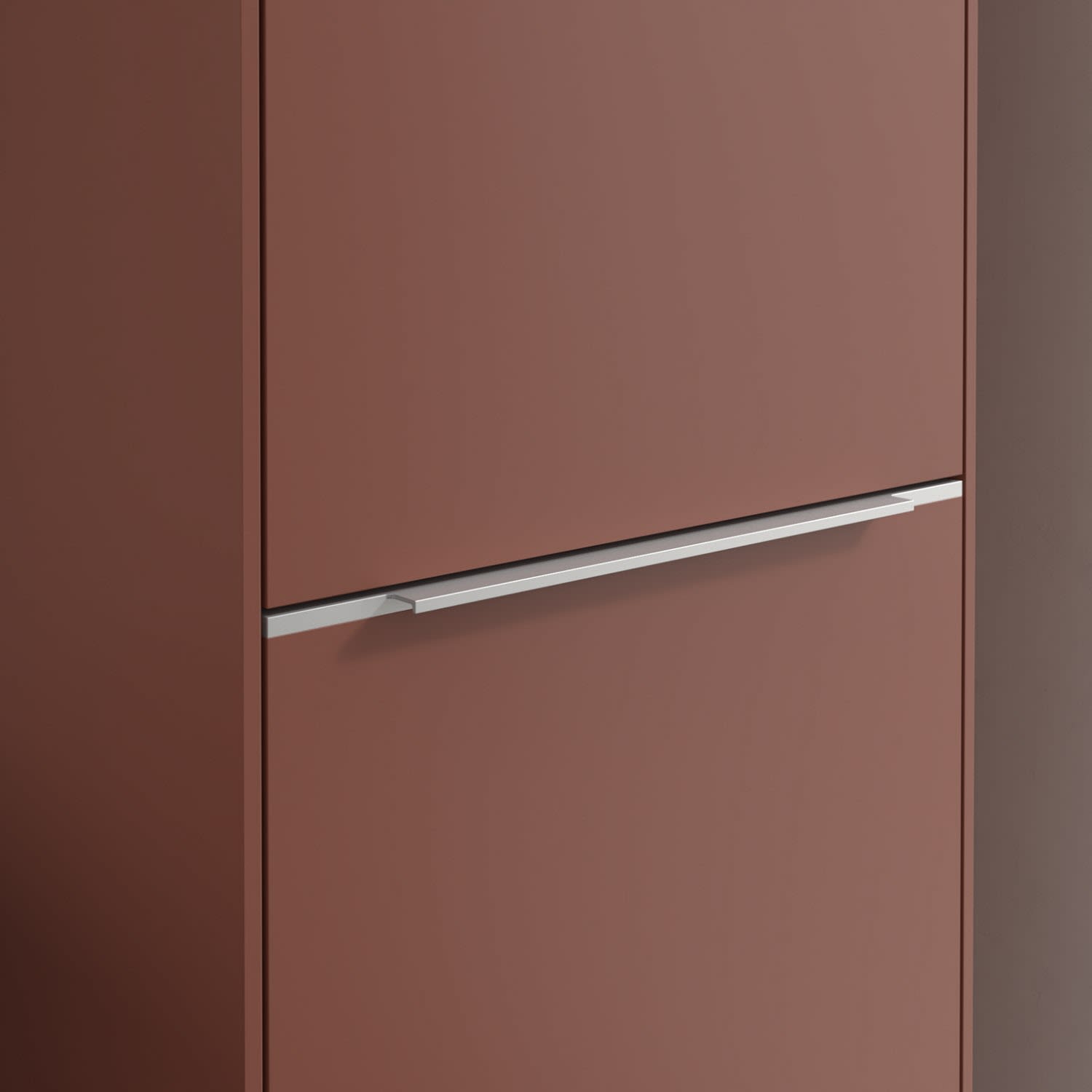 Der geschlossene Hochschrank der Kollektion Subway 3.0 von Villeroy & Boch zeigt sich gradlinig und zeitlos. Er ist die perfekte Ergänzung zum Waschbeckenunterschrank und bietet Stauraum für Handtücher und andere Badutensilien. Front und Korpus sind mit einer hochwertigen Direktbeschichtung oder Lackierung, deren Anti-Fingerprint-Oberfläche unschönen Fingerabdrücken vorbeugt, versehen. Hinter der oberen Tür mit Türanschlag rechts befinden sich zwei hochwertige Einlegeböden aus Glas und ein fester Fachboden. Während die obere Tür sich durch sanftes Tippen öffnen lässt, ist die untere Tür mit einer praktischen, dezenten Griffleiste ausgestattet. Daher befindet sich ein integrierter Wäschekorb, in dem kurzerhand die schmutzige Wäsche verschwindet.