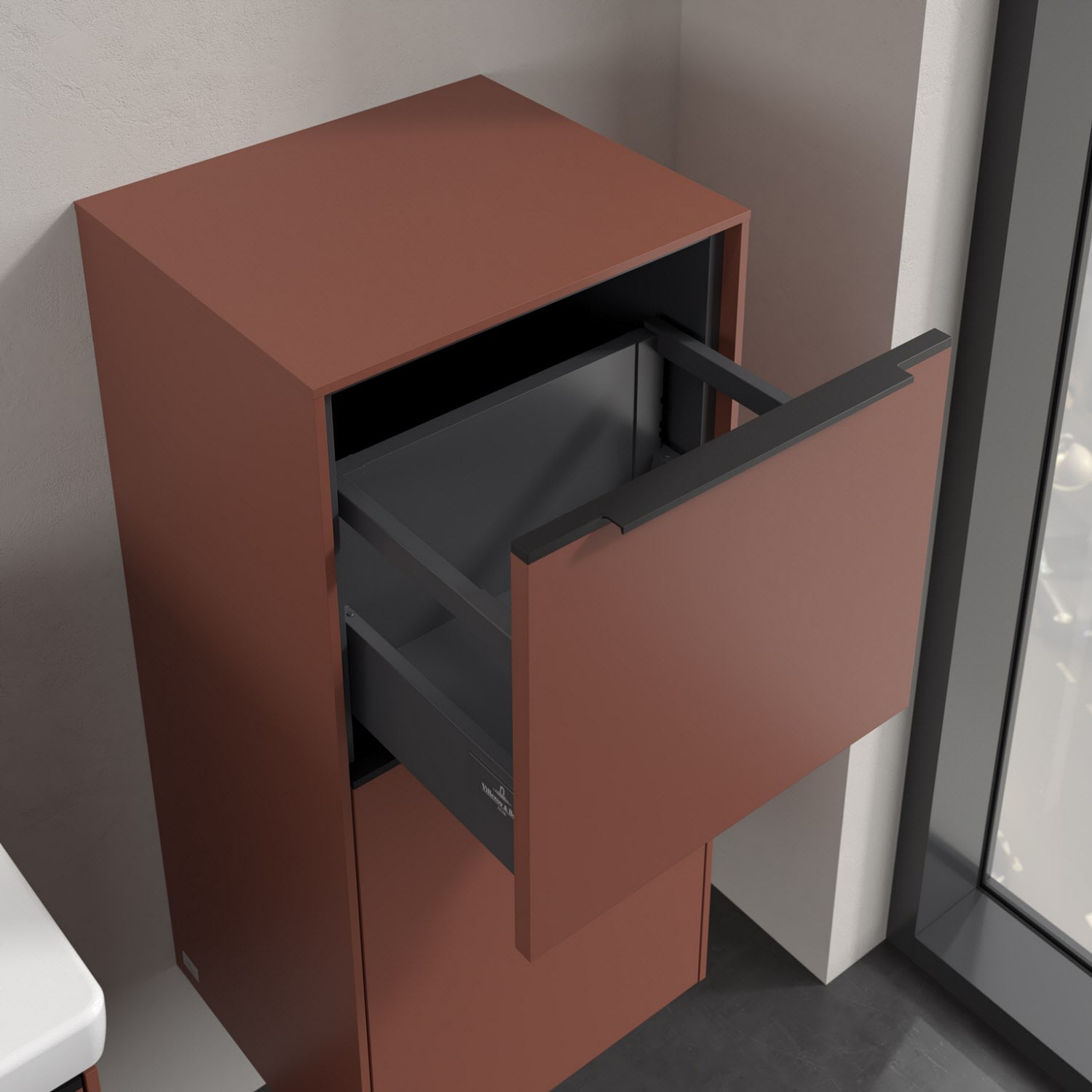 Der Seitenschrank der Kollektion Subway 3.0 von Villeroy & Boch zeigt sich gradlinig und zeitlos. Er ist die perfekte Ergänzung zum Waschbeckenunterschrank und bietet Stauraum für Handtücher und andere Badutensilien. Front und Korpus sind mit einer hochwertigen Direktbeschichtung oder Lackierung, deren Anti-Fingerprint-Oberfläche unschönen Fingerabdrücken vorbeugt, versehen. Hinter der nach rechts öffnenden Tür mit praktischer, dezenter Griffleiste verbirgt sich ein stabiler Einlegeboden aus Glas. Die voll ausziehbare Schublade mit rutschhemmendem Boden und Selbsteinzug-Funktion sorgt dafür, dass auch kleinere Utensilien übersichtlich verstaut werden können.
