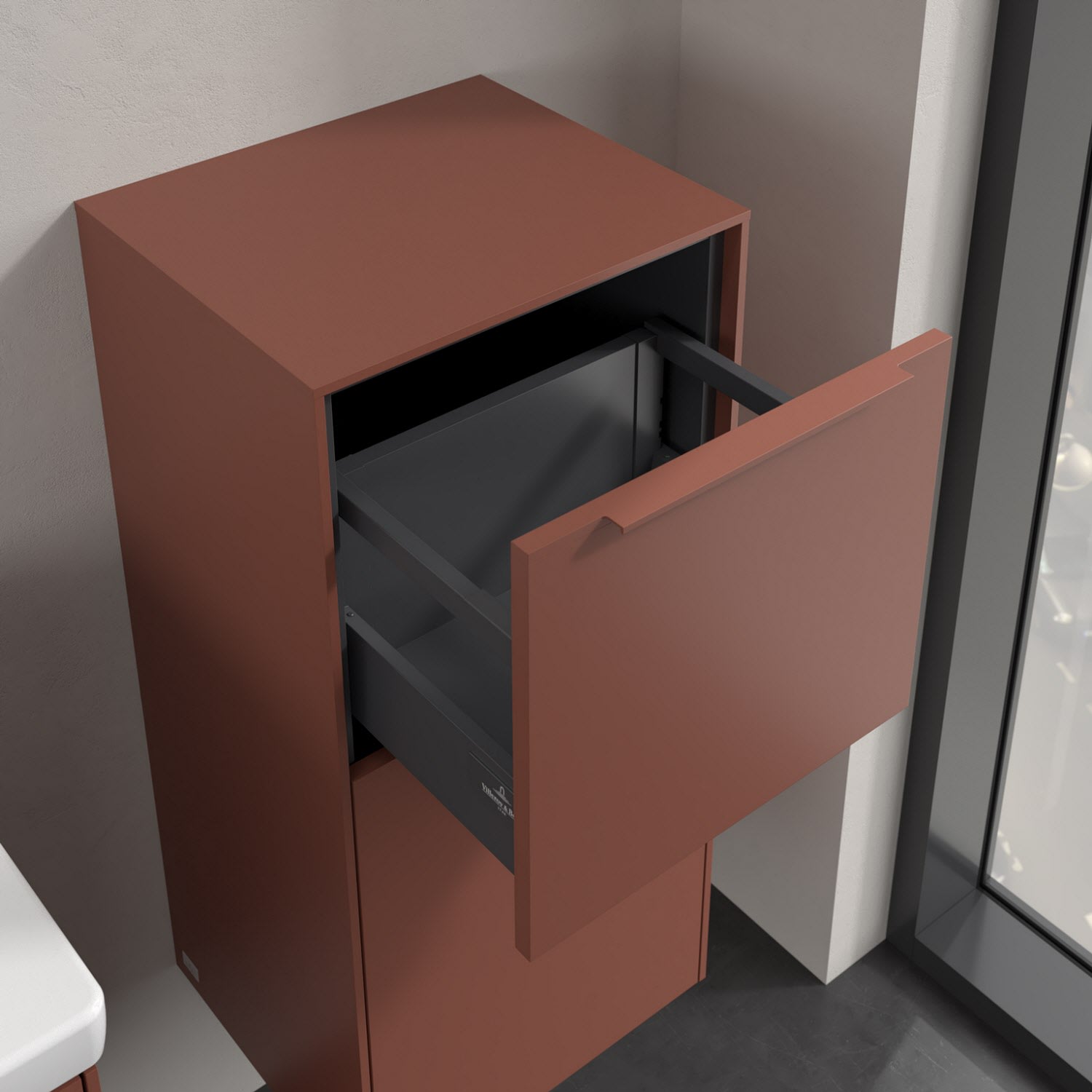 Der Seitenschrank der Kollektion Subway 3.0 von Villeroy & Boch zeigt sich gradlinig und zeitlos. Er ist die perfekte Ergänzung zum Waschbeckenunterschrank und bietet Stauraum für Handtücher und andere Badutensilien. Front und Korpus sind mit einer hochwertigen Direktbeschichtung oder Lackierung, deren Anti-Fingerprint-Oberfläche unschönen Fingerabdrücken vorbeugt, versehen. Hinter der nach rechts öffnenden Tür mit praktischer, dezenter Griffleiste verbirgt sich ein stabiler Einlegeboden aus Glas. Die voll ausziehbare Schublade mit rutschhemmendem Boden und Selbsteinzug-Funktion sorgt dafür, dass auch kleinere Utensilien übersichtlich verstaut werden können.