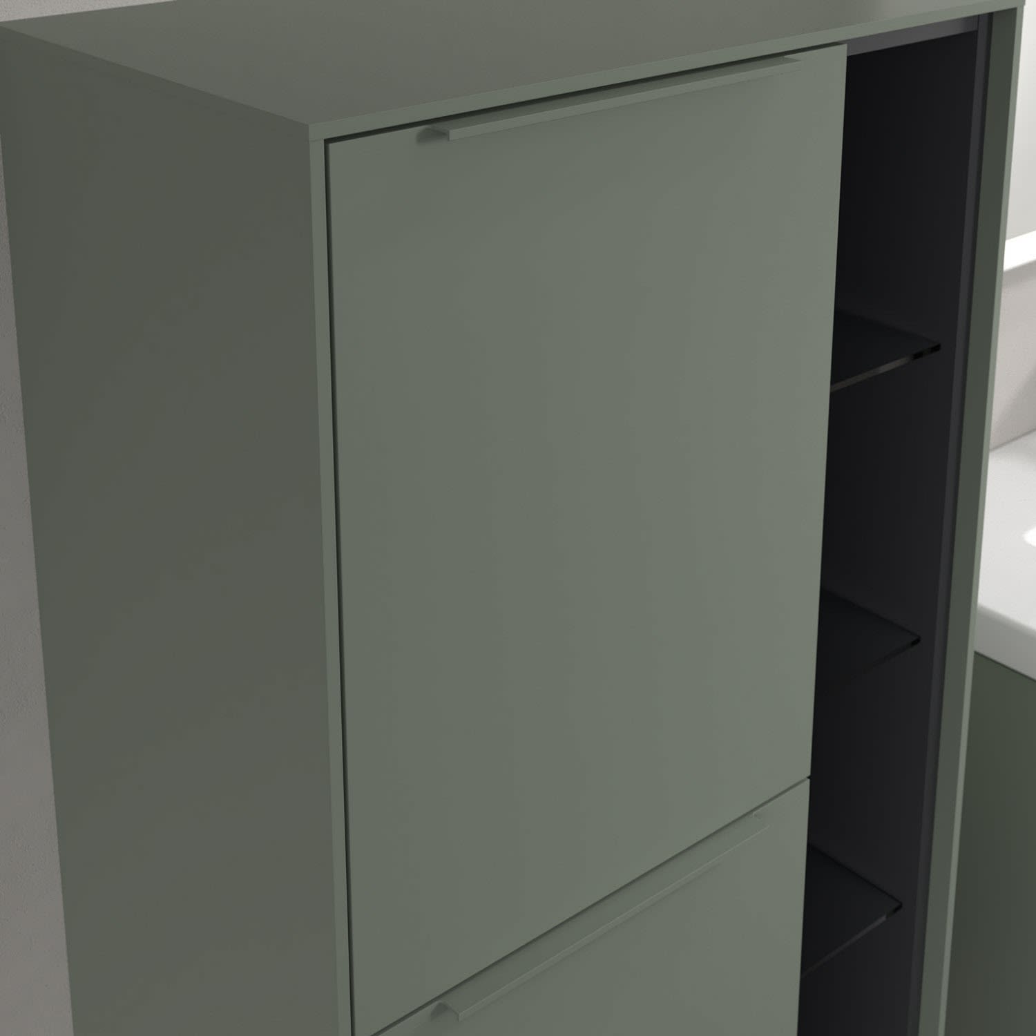 Der offene Mittelschrank der Kollektion Subway 3.0 von Villeroy & Boch zeigt sich gradlinig und zeitlos. Er ist die perfekte Ergänzung zum Waschbeckenunterschrank und bietet ausreichend Stauraum. Front und Korpus sind mit einer hochwertigen Direktbeschichtung oder Lackierung, deren Anti-Fingerprint-Oberfläche unschönen Fingerabdrücken vorbeugt, versehen. Hinter den zwei nach links öffnenden Türen mit praktischer, dezenter Griffleiste verbergen sich zwei stabile Einlegeböden aus Glas. Das offene Fach bietet dank vier zusätzlicher Einlegeböden aus Glas weiteren Raum für notwendige Badutensilien.