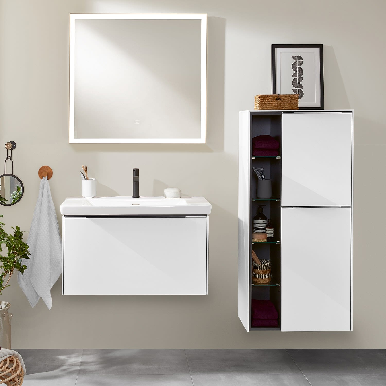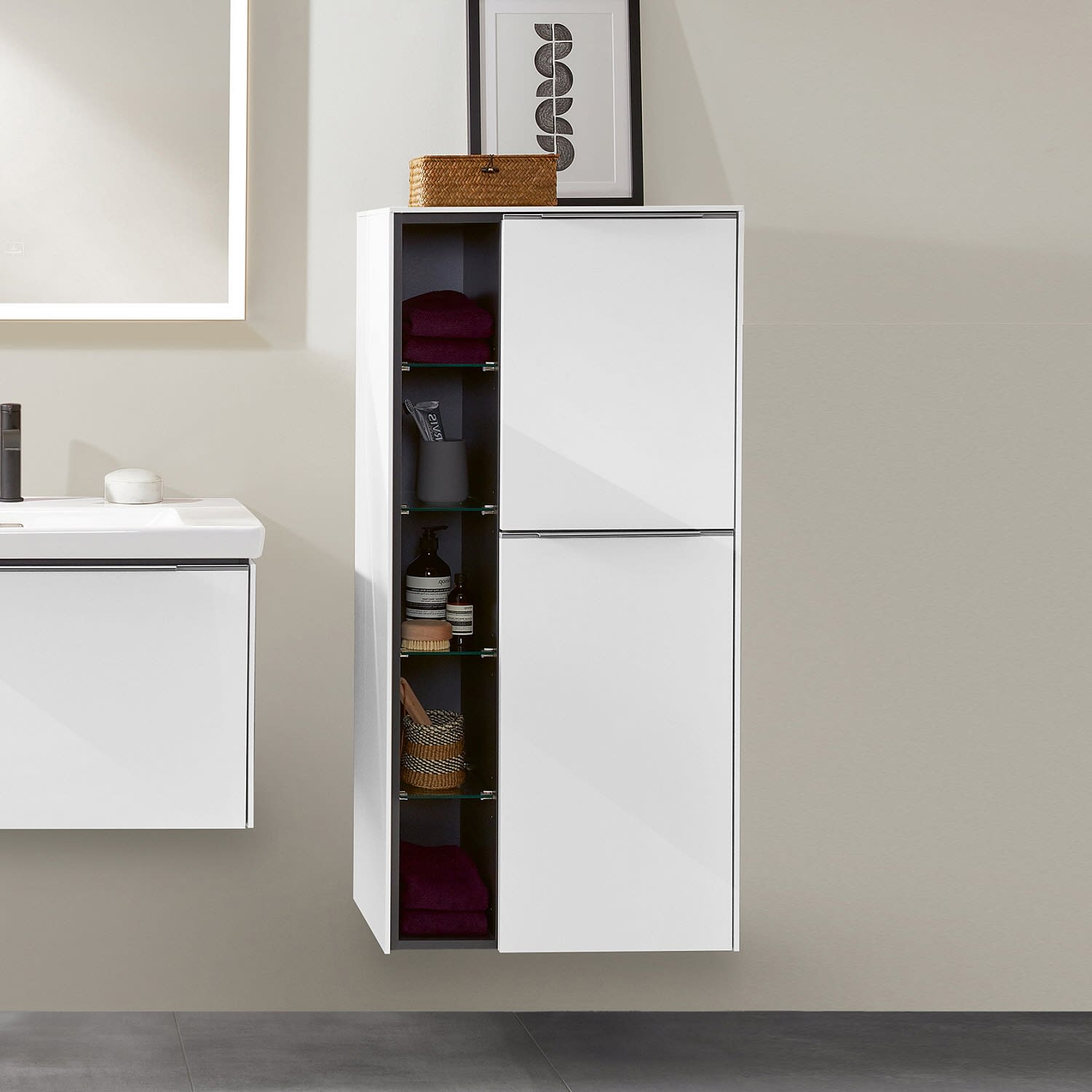 Der offene Mittelschrank der Kollektion Subway 3.0 von Villeroy & Boch zeigt sich gradlinig und zeitlos. Er ist die perfekte Ergänzung zum Waschbeckenunterschrank und bietet ausreichend Stauraum. Front und Korpus sind mit einer hochwertigen Direktbeschichtung oder Lackierung, deren Anti-Fingerprint-Oberfläche unschönen Fingerabdrücken vorbeugt, versehen. Hinter den zwei nach rechts öffnenden Türen mit praktischer, dezenter Griffleiste verbergen sich zwei stabile Einlegeböden aus Glas. Das offene Fach bietet dank vier zusätzlicher Einlegeböden aus Glas weiteren Raum für notwendige Badutensilien.
