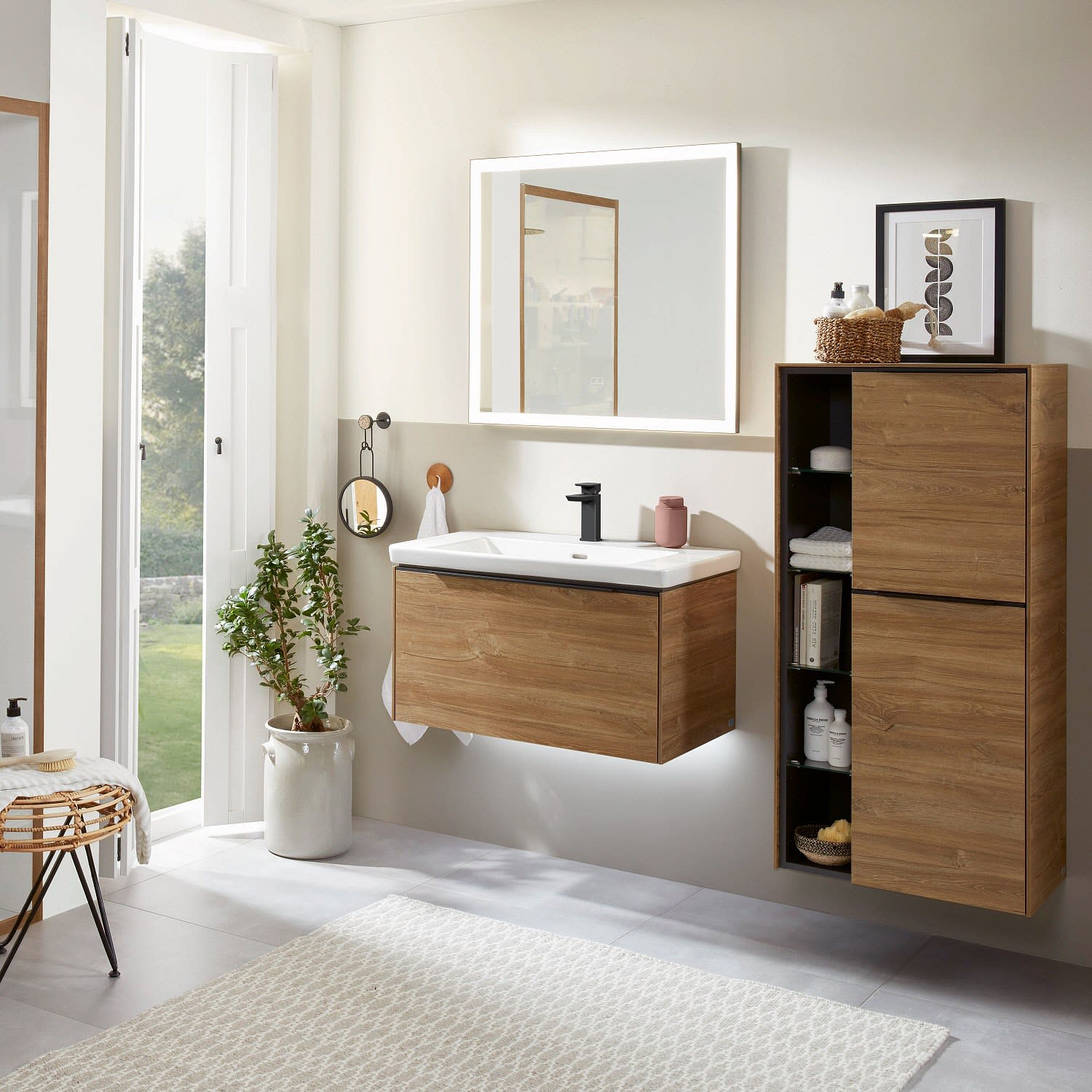 Der offene Mittelschrank der Kollektion Subway 3.0 von Villeroy & Boch zeigt sich gradlinig und zeitlos. Er ist die perfekte Ergänzung zum Waschbeckenunterschrank und bietet ausreichend Stauraum. Front und Korpus sind mit einer hochwertigen Direktbeschichtung oder Lackierung, deren Anti-Fingerprint-Oberfläche unschönen Fingerabdrücken vorbeugt, versehen. Hinter den zwei nach rechts öffnenden Türen mit praktischer, dezenter Griffleiste verbergen sich zwei stabile Einlegeböden aus Glas. Das offene Fach bietet dank vier zusätzlicher Einlegeböden aus Glas weiteren Raum für notwendige Badutensilien.