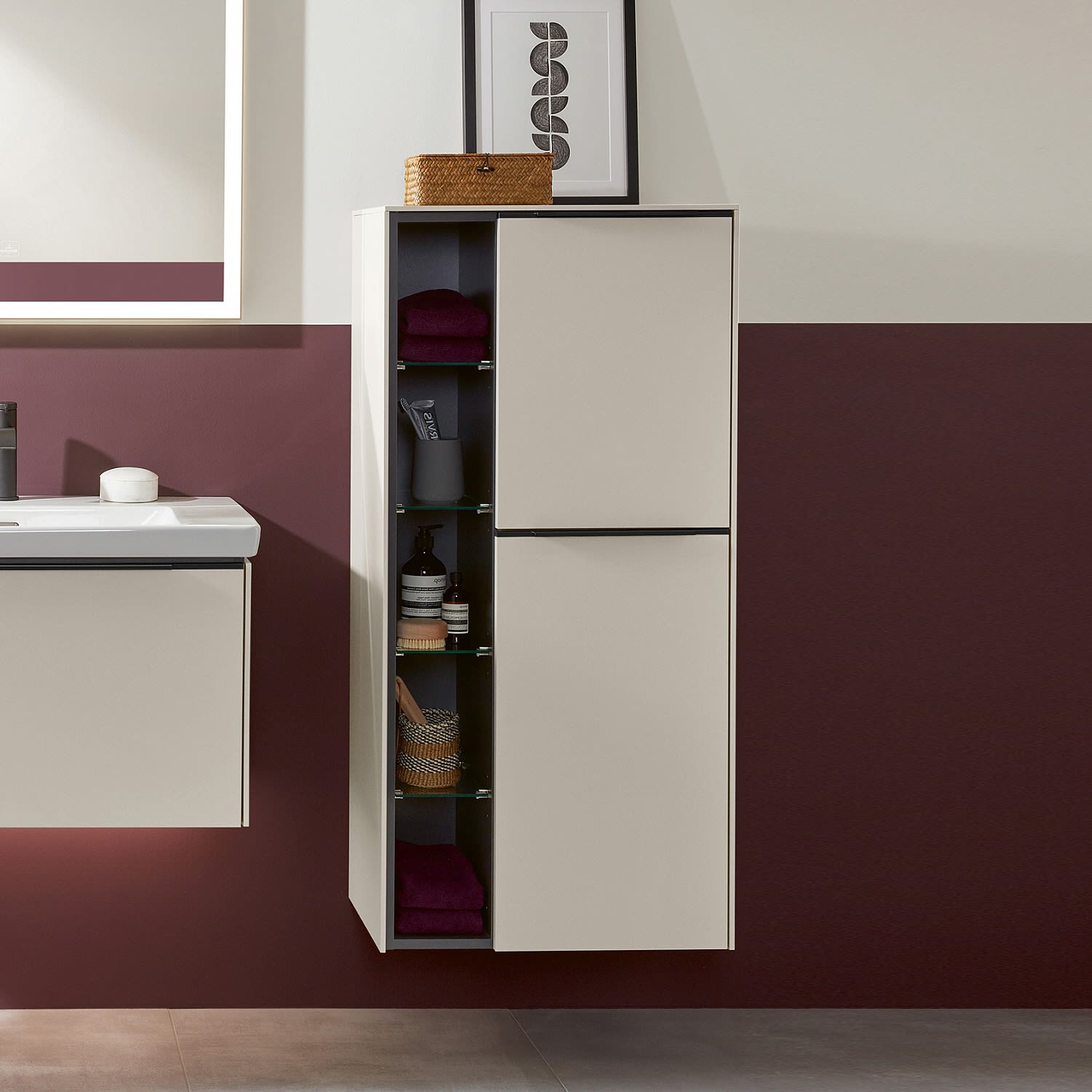 Der offene Mittelschrank der Kollektion Subway 3.0 von Villeroy & Boch zeigt sich gradlinig und zeitlos. Er ist die perfekte Ergänzung zum Waschbeckenunterschrank und bietet ausreichend Stauraum. Front und Korpus sind mit einer hochwertigen Direktbeschichtung oder Lackierung, deren Anti-Fingerprint-Oberfläche unschönen Fingerabdrücken vorbeugt, versehen. Hinter den zwei nach rechts öffnenden Türen mit praktischer, dezenter Griffleiste verbergen sich zwei stabile Einlegeböden aus Glas. Das offene Fach bietet dank vier zusätzlicher Einlegeböden aus Glas weiteren Raum für notwendige Badutensilien.