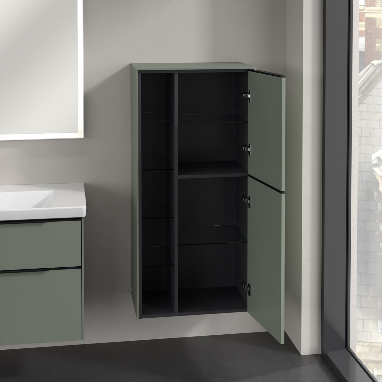 Der offene Mittelschrank der Kollektion Subway 3.0 von Villeroy & Boch zeigt sich gradlinig und zeitlos. Er ist die perfekte Ergänzung zum Waschbeckenunterschrank und bietet ausreichend Stauraum. Front und Korpus sind mit einer hochwertigen Direktbeschichtung oder Lackierung, deren Anti-Fingerprint-Oberfläche unschönen Fingerabdrücken vorbeugt, versehen. Hinter den zwei nach rechts öffnenden Türen mit praktischer, dezenter Griffleiste verbergen sich zwei stabile Einlegeböden aus Glas. Das offene Fach bietet dank vier zusätzlicher Einlegeböden aus Glas weiteren Raum für notwendige Badutensilien.