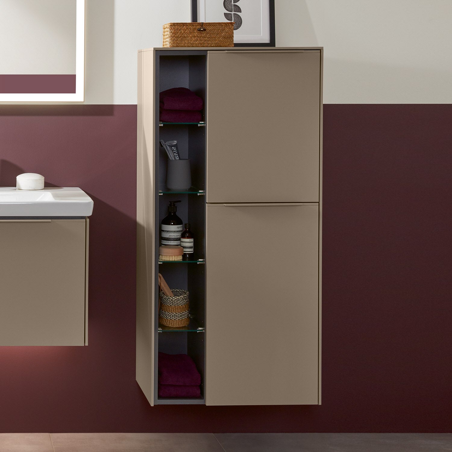 Der offene Mittelschrank der Kollektion Subway 3.0 von Villeroy & Boch zeigt sich gradlinig und zeitlos. Er ist die perfekte Ergänzung zum Waschbeckenunterschrank und bietet ausreichend Stauraum. Front und Korpus sind mit einer hochwertigen Direktbeschichtung oder Lackierung, deren Anti-Fingerprint-Oberfläche unschönen Fingerabdrücken vorbeugt, versehen. Hinter den zwei nach rechts öffnenden Türen mit praktischer, dezenter Griffleiste verbergen sich zwei stabile Einlegeböden aus Glas. Das offene Fach bietet dank vier zusätzlicher Einlegeböden aus Glas weiteren Raum für notwendige Badutensilien.