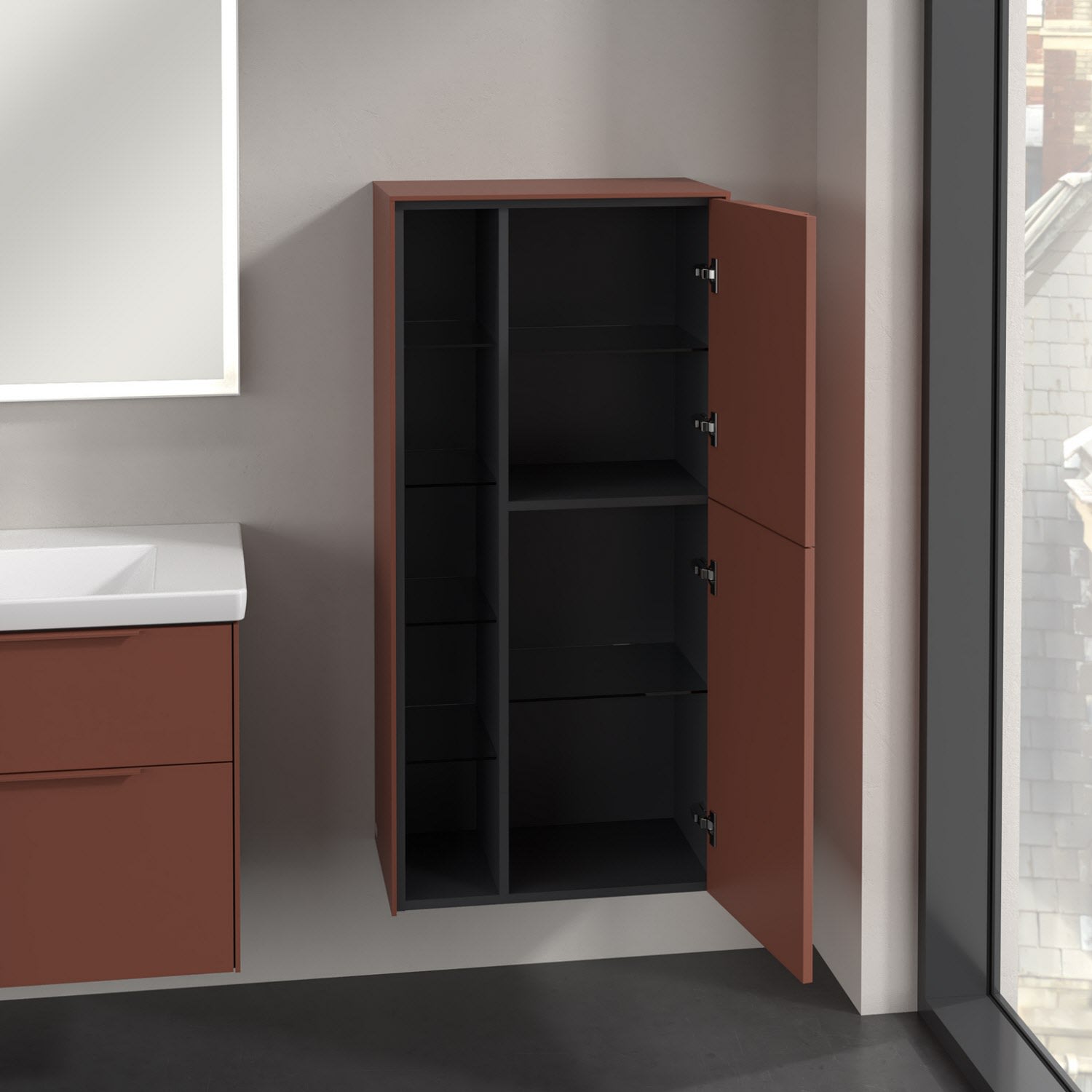 Der offene Mittelschrank der Kollektion Subway 3.0 von Villeroy & Boch zeigt sich gradlinig und zeitlos. Er ist die perfekte Ergänzung zum Waschbeckenunterschrank und bietet ausreichend Stauraum. Front und Korpus sind mit einer hochwertigen Direktbeschichtung oder Lackierung, deren Anti-Fingerprint-Oberfläche unschönen Fingerabdrücken vorbeugt, versehen. Hinter den zwei nach rechts öffnenden Türen mit praktischer, dezenter Griffleiste verbergen sich zwei stabile Einlegeböden aus Glas. Das offene Fach bietet dank vier zusätzlicher Einlegeböden aus Glas weiteren Raum für notwendige Badutensilien.