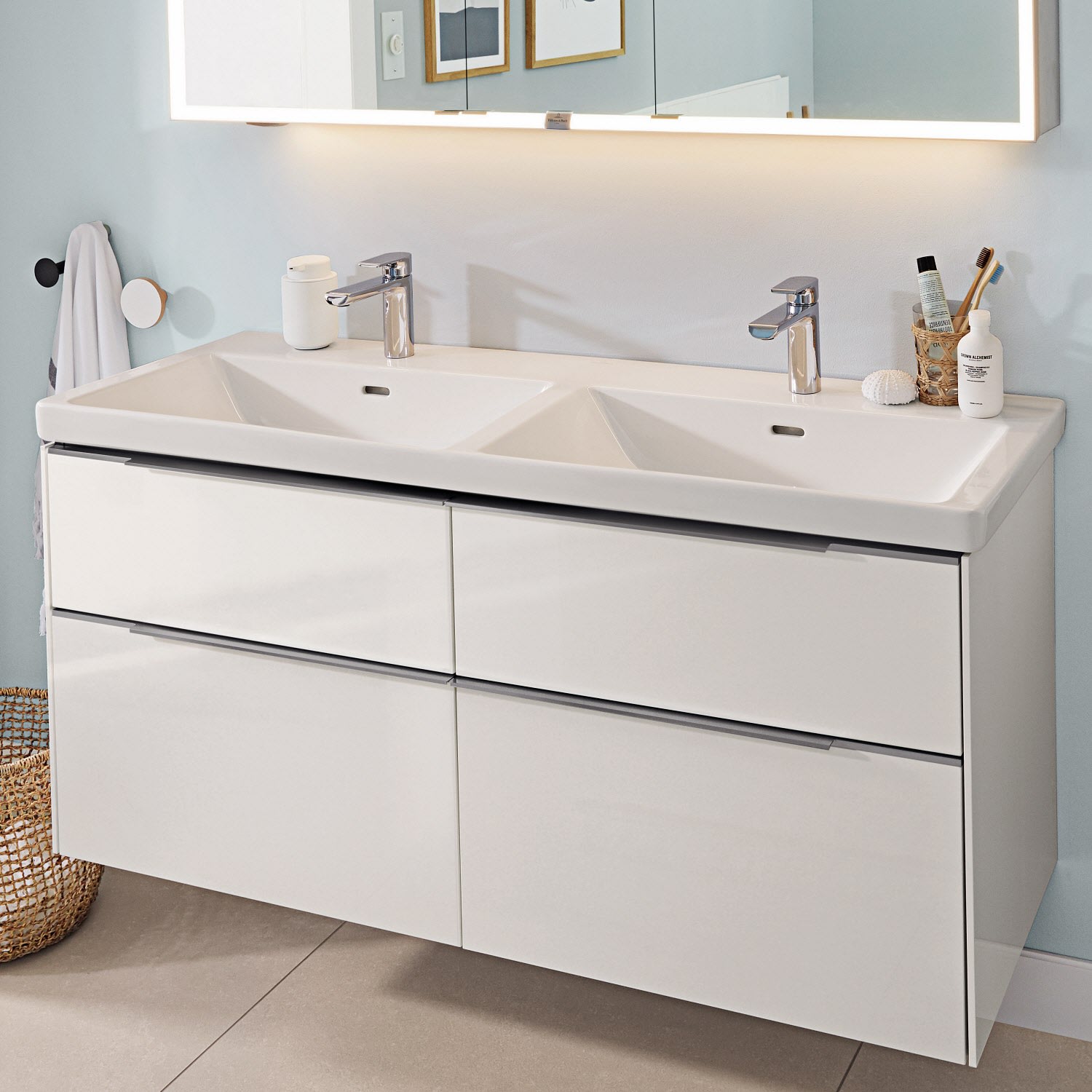 Das Möbel-Set der Kollektion Subway 3.0 von Villeroy & Boch besteht aus einem Waschtisch im gewohnt zeitlosem Design und einem Waschtischunterschrank der sich durch großzügigen Stauraum auszeichnet. Das Set passt perfekt in die unterschiedlichsten Badsituationen. Highlight ist die LED-Bodenbeleuchtung, die stimmungsvolles, sanftes Licht ins Bad bringt und nachts als Orientierungshilfe dient. Der Waschtisch mit seinem schmalen Rand und das längliche Überlaufloch sorgen für einen modernen Look und ein stilvolles Gesamtbild. Das tiefe Becken ermöglicht eine vielfältige Nutzung auch abseits von Hände waschen und Zähne putzen: Es bietet beispielsweise ausreichend Platz zum Haare waschen oder Einweichen von Wäsche.Sowohl auf der breiten Hahnlochbank wie auch den beiden seitlichen Ablageflächen findet sich genügend Fläche für Seifenspender und andere Utensilien. Noch ein Pluspunkt: Dank der schmutzabweisenden Oberfläche fällt die Reinigung besonders leicht. Gefertigt ist der Waschtisch aus dem innovativen Werkstoff TitanCeram. Er verleiht ihm seine feinen Konturen und macht es besonders widerstandsfähig und robust – für lange Freude am Produkt!