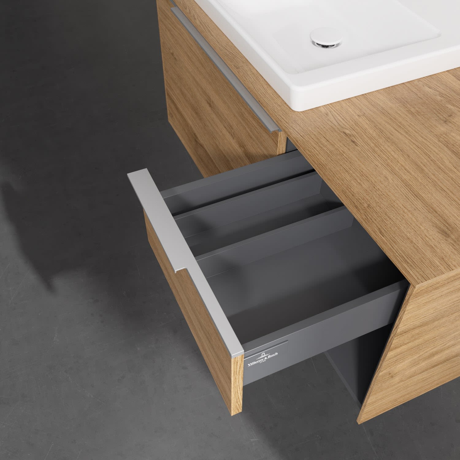 Der Waschtischunterschrank besticht durch gradliniges Design und großzügigen Stauraum. Front und Korpus sind hochwertig verarbeitet. Zwei voll ausziehbare Schubladen mit rutschhemmenden Böden, Selbsteinzug-Funktion sowie zwei integrierten kleinen Accessory-Boxen bieten Platz für Pflege- und Hygieneartikel. Die dezente Griffleiste sorgt für einfache Handhabung und bildet einen besonderen Design-Akzent.