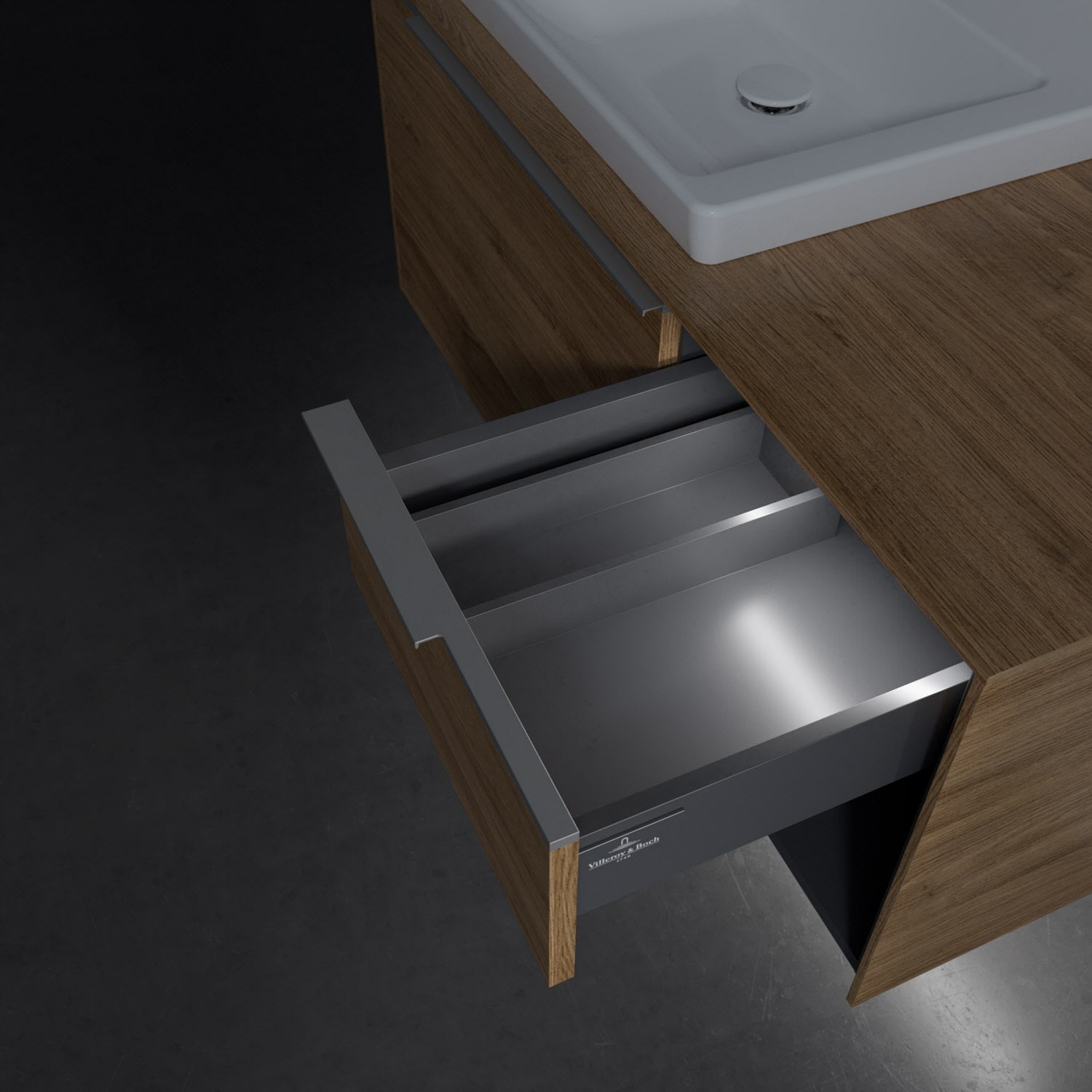 Der Waschtischunterschrank besticht durch gradliniges Design und großzügigen Stauraum. Front und Korpus sind hochwertig verarbeitet. Zwei voll ausziehbare Schubladen mit rutschhemmenden Böden, Selbsteinzug-Funktion sowie zwei integrierten kleinen Accessory-Boxen bieten Platz für Pflege- und Hygieneartikel. Die dezente Griffleiste sorgt für einfache Handhabung und bildet einen besonderen Design-Akzent.