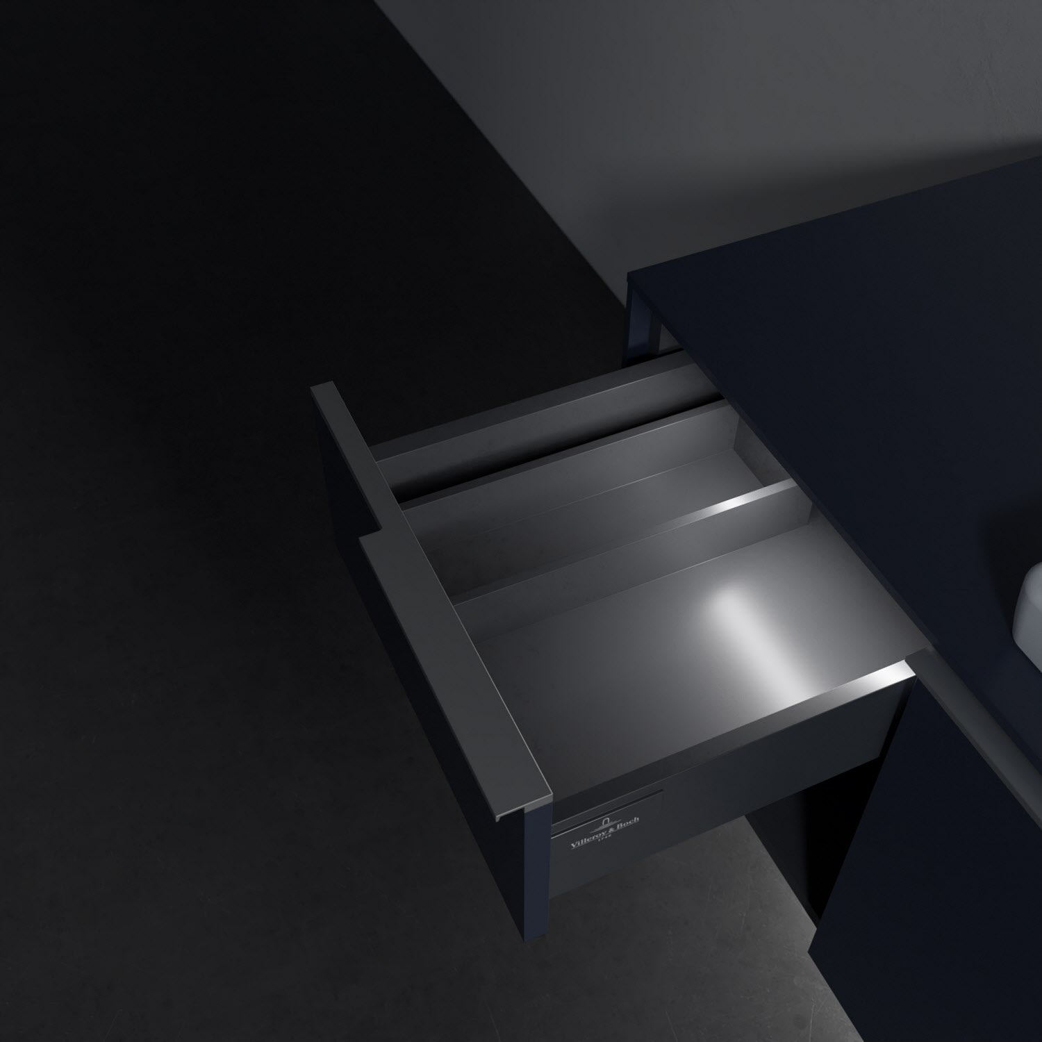 Der Waschtischunterschrank besticht durch gradliniges Design und großzügigen Stauraum. Front und Korpus sind hochwertig verarbeitet. Zwei voll ausziehbare Schubladen mit rutschhemmenden Böden, Selbsteinzug-Funktion sowie zwei integrierten kleinen Accessory-Boxen bieten Platz für Pflege- und Hygieneartikel. Die dezente Griffleiste sorgt für einfache Handhabung und bildet einen besonderen Design-Akzent.