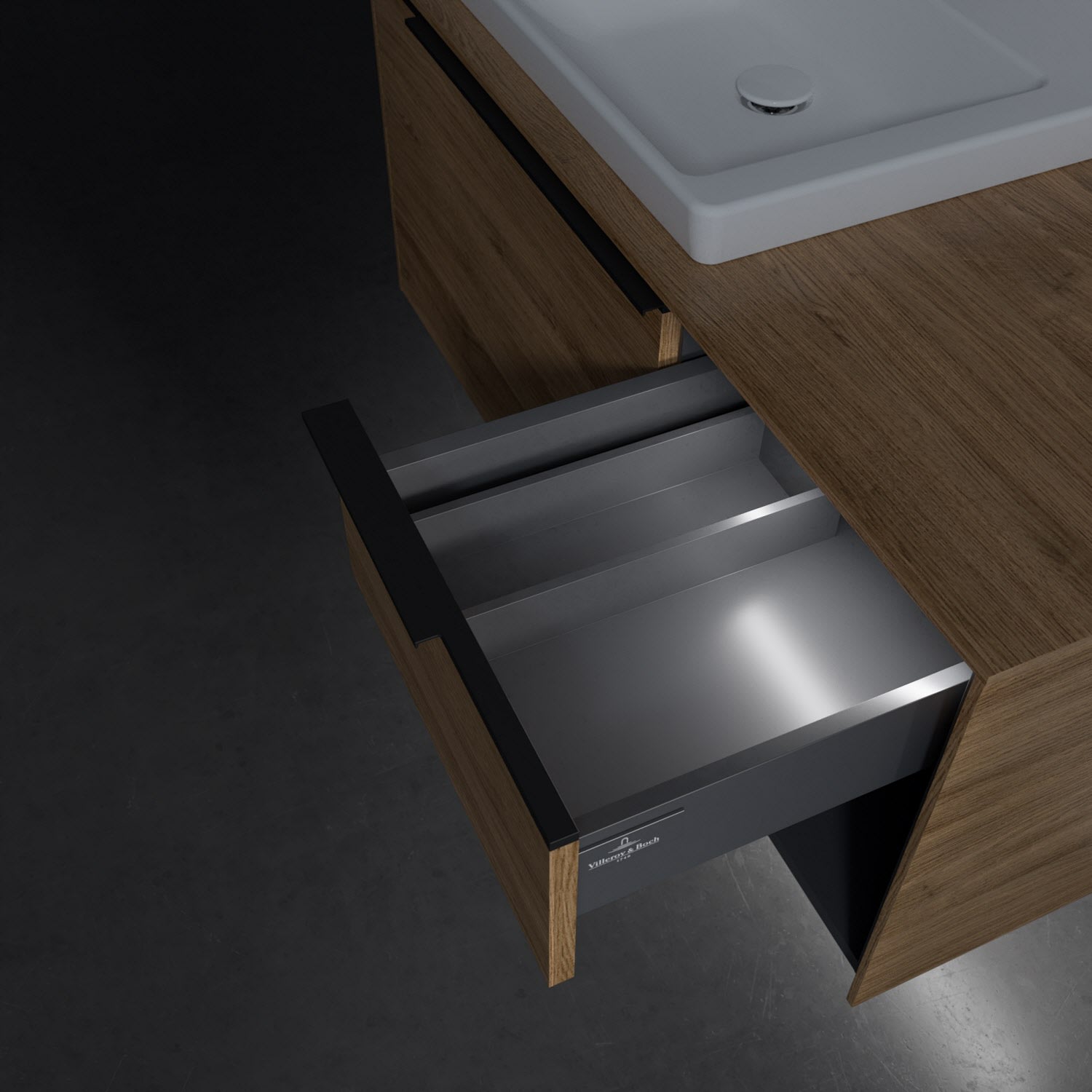 Der Waschtischunterschrank besticht durch gradliniges Design und großzügigen Stauraum. Front und Korpus sind hochwertig verarbeitet. Zwei voll ausziehbare Schubladen mit rutschhemmenden Böden, Selbsteinzug-Funktion sowie zwei integrierten kleinen Accessory-Boxen bieten Platz für Pflege- und Hygieneartikel. Die dezente Griffleiste sorgt für einfache Handhabung und bildet einen besonderen Design-Akzent.