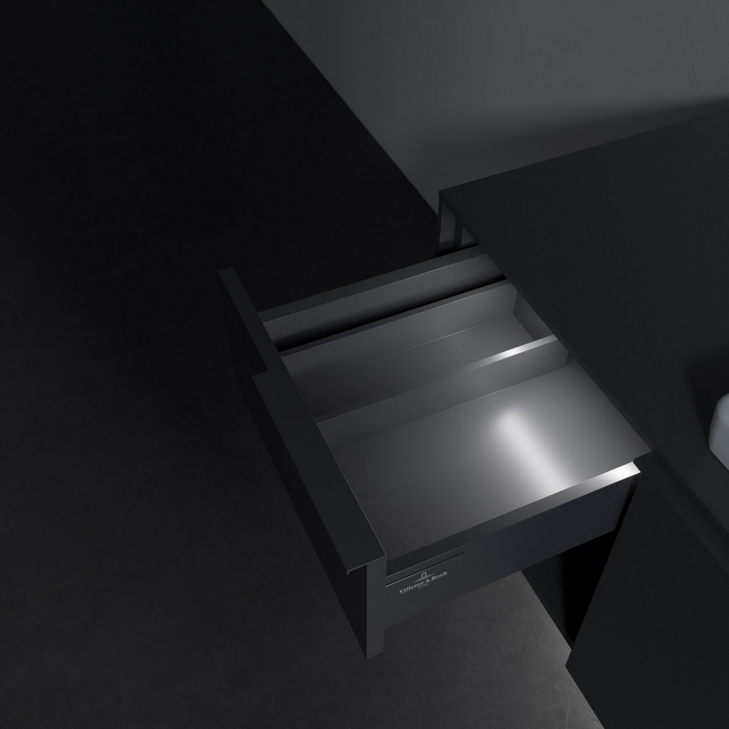 Der Waschtischunterschrank besticht durch gradliniges Design und großzügigen Stauraum. Front und Korpus sind hochwertig verarbeitet. Zwei voll ausziehbare Schubladen mit rutschhemmenden Böden, Selbsteinzug-Funktion sowie zwei integrierten kleinen Accessory-Boxen bieten Platz für Pflege- und Hygieneartikel. Die dezente Griffleiste sorgt für einfache Handhabung und bildet einen besonderen Design-Akzent.