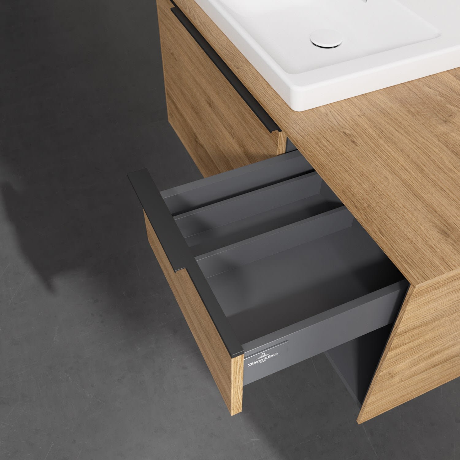 Der Waschtischunterschrank besticht durch gradliniges Design und großzügigen Stauraum. Front und Korpus sind hochwertig verarbeitet. Zwei voll ausziehbare Schubladen mit rutschhemmenden Böden, Selbsteinzug-Funktion sowie zwei integrierten kleinen Accessory-Boxen bieten Platz für Pflege- und Hygieneartikel. Die dezente Griffleiste sorgt für einfache Handhabung und bildet einen besonderen Design-Akzent.