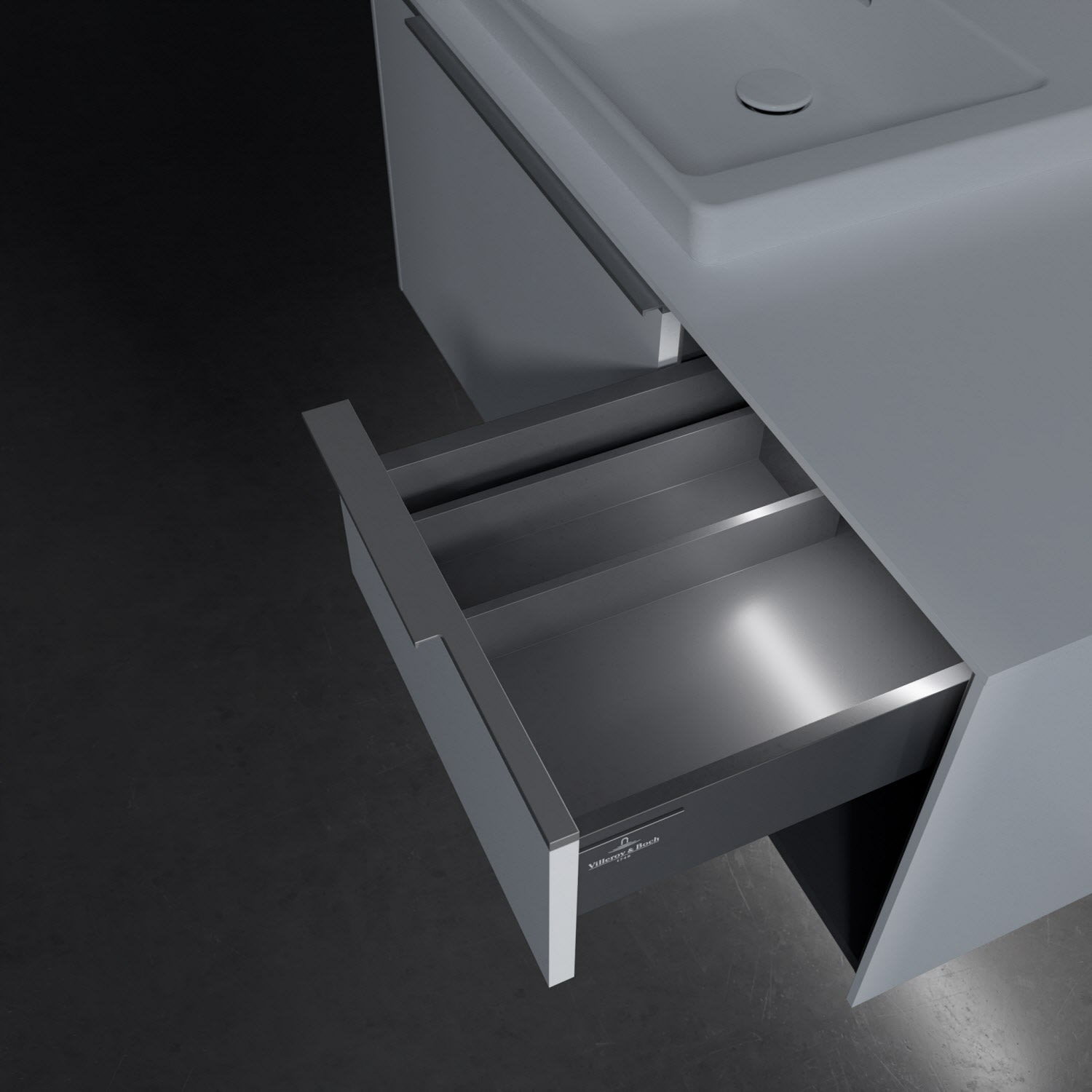 Der Waschtischunterschrank besticht durch gradliniges Design und großzügigen Stauraum. Front und Korpus sind hochwertig verarbeitet. Zwei voll ausziehbare Schubladen mit rutschhemmenden Böden, Selbsteinzug-Funktion sowie zwei integrierten kleinen Accessory-Boxen bieten Platz für Pflege- und Hygieneartikel. Die dezente Griffleiste sorgt für einfache Handhabung und bildet einen besonderen Design-Akzent.